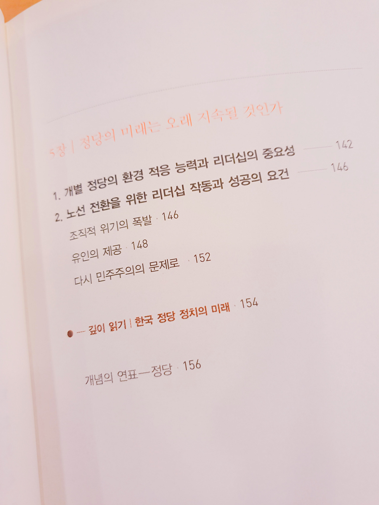 개별정당의 환경적응능력과 리더십의 중요성에 대해서 생각해보자. 사회변화에 따른 창조적 노선 전환이 필요하다. 필요한 능력은 3가지인데, 유리한 정치적이고 조직적인 대안 동원능력과 불리한 갈등을 새로운 갈등 축으로 대체할 능력, 새로운 유권자 편성 조직 능력이 그것이다. 정치환경 변화에 따라서 정당의 변화를 이끌어내는 리더십이 중요하다.