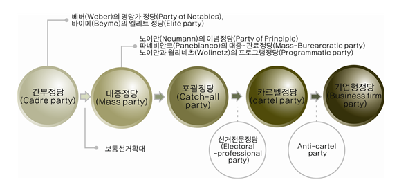 정당모델은 ‘엘리트정당-대중정당-포괄정당-선거전문가정당-카르텔정당-기업형정당’으로 변화되었다. 엘리트정당은 소수의 저명 정치인을 중심으로 민주주의 발전에 따라 전환이 필연적이 되었다. 대중정당은 사회적 통합정당이며 이데올로기가 핵심요소였다. 당내 조직 기구와 교육시스템이 촘촘하고 당원이 핵심동력이었다. 포괄정당은 이데올로기나 당원이 중요성이 떨어짐에 따라 대중정당이 변화하는 경향을 보이며 대립쟁점보다는 합의쟁점의 비중이 커지고, 좌우파 모두 온건해지는 경향을 보인다. 지도부와 인물의 영향력이 커진다. 선거전문가 정당은 정당조직의 전문화가 이루어지고 관심의 초점이 당원에서 유권자로 이동하게 된다. 그러나 유권자와의 연계성은 약하고 자본집약적이다. 카르텔정당은 새로운 정치집단의 도상을 막기 위해서 정당-정당, 국가, 이익집단, 사법권력 등과의 결탁을 하는 것을 말한다. 기업형정당은 정치의 상품화와 선거의 마케팅화에 의해서 이루어진다.