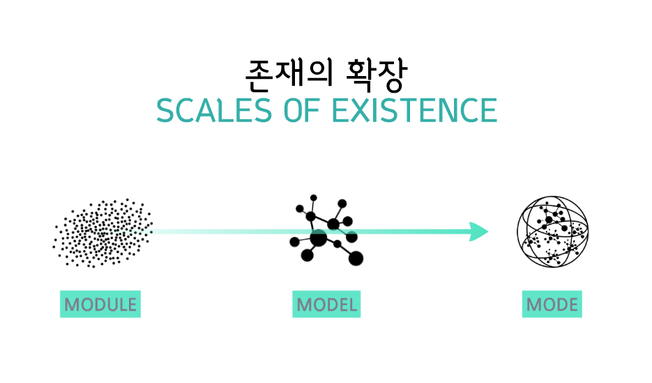 스피노자의 개념에서 볼 때 형성되지 않았으나 잠재적으로 존재하는 것이 modus였고 이것이 발현되면 각각의 형체가 되듯이 우리 안에 아직 발현되지 않은 생각들은 잠재적으로 존재하고 있고, 우리가 펜을 들고, 붓을 드는 순간 현실의 실제 재료들과 만나서 새로운 모듈이, 모델이 되어서 하나의 모드를 만들어 낼 것이다.