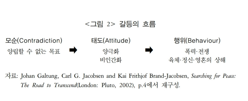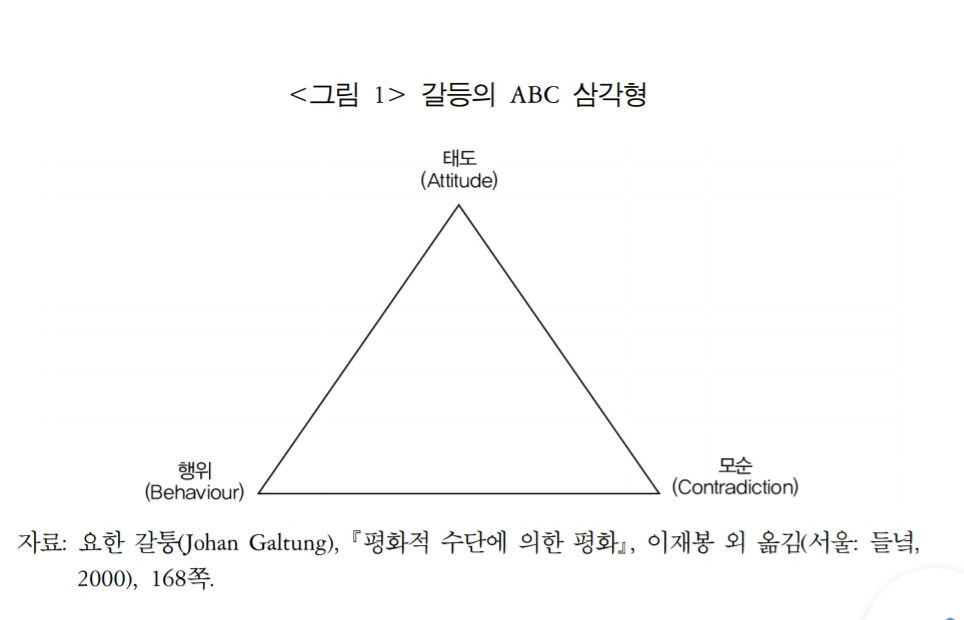 따르면 평화는 과정 혹은 구조 어느 한 가지가 아니라 동시에 두 가지 모두를 포괄하는 것이다. 평화 구축은 협약 혹은 합의라는 시점 혹은 사건에만 초점을 맞추는 것이 아니라, 한정된 시간 속 협약 과제 이행의 기능을 넘어 실제 삶의 필요 및 변화에 능동적으로 응답할 수 있는 끊임없는 관계 구축 과정·구조가 되어야 한다. 이런 평화 구축이라는 큰 틀 속에서, 갈등이라는 현상에 대해 이를 해결하려는(갈등해결, conflict resolution) 입장의 평화학 이론과 이를 전 환시키려는(갈등전환, conflict transformation) 입장의 이론이 나타났다. 먼 저 갈등해결 이론이란 갈등의 근본 원인을 분석하고 직접적·구조적 폭력을 해소하기 위한 전략과 기술을 개발하려는 시도이다. 갈등전환 이론은 갈등의 근본 원인을 제거 하거나 인간관계를 통제하려는 것이 아니라, 오히려 발생한 갈등을 활용할 수 있는 창의적 상상력을 통해 사회적 관계를 평화적으로 재 구성하는 것을 그 목표로 한다. 갈등전환론자인 갈퉁은 갈 등해결은 임시 목적이고 방편이지만, 갈등전환은 갈등의 변화를 수용 할 수 있고 유지할 수 있는 능력이라고 주장한다.25) 이에 대해 갈퉁은 <그림 1>과 같은 삼각형 구조를 들어 설명한다.