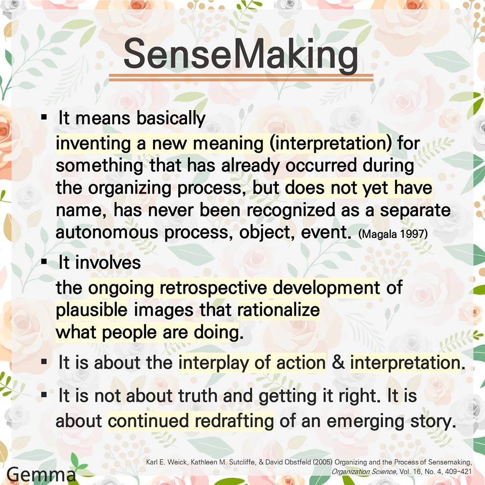 센스메이킹은 이미 조직 내에서 일어나고 있는 상황들에 대해서 새로운 해석과 의미를 더해주는 기법이라고 할 수 있다. 우리는 어떤 방식으로든 조직의 변화, 사람들의 행동, 자신의 상황에 대한 해석을 내리고 있고, 그러한 해석을 기반으로 사람들과 상호작용을 해 나가고 있다.
