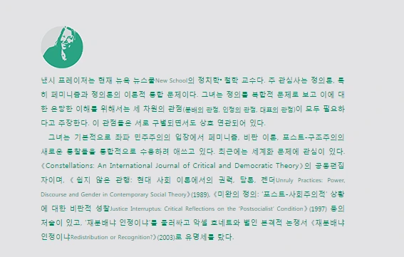 낸시프레이저의 이론들을 살펴보면서 누군가를 정의내리거나 우리 스스로를 정의내릴 때 아찔함들을 느낀다. 낸시프레이저는 헤겔의 인정투쟁에서부터 시작해서 독일의 프랑크푸르트학파 3세대 학자인 악셀호네트를 비평하면서 새로운 '지위이론'을 제시한다.