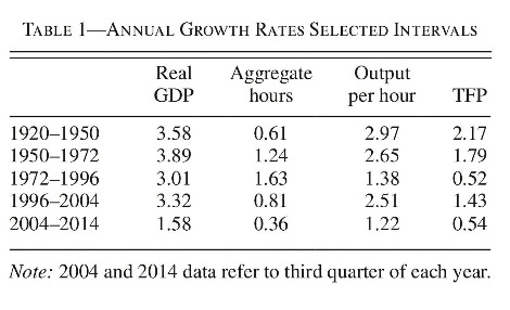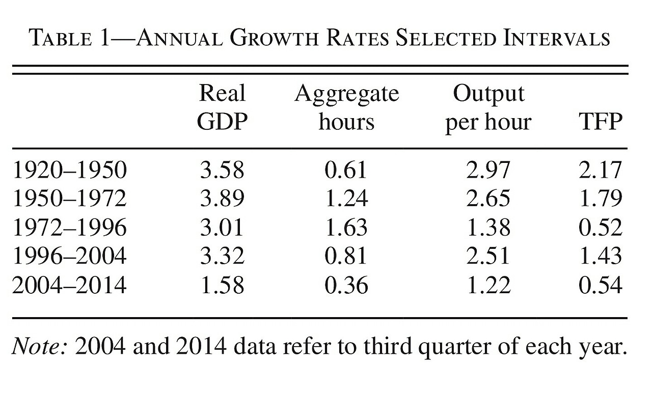 테이블 1에서 볼 때 최근 100년 중에 가장 실질 GDP성장이 둔화된 상태를 2004-2014년까지 볼 수 있다. 또한 1972년보타 20014년에는 인구증가율 둔화 및 노동시장 참여율 감소에 따른 '노동'감소를 볼 수 있다. 1920-1950년에는 철도, 전력, 전화기, 자동차 등의 상용화로 20세기 1차 및 2차 산업혁명기를 볼 수 있고 여기서 TFP는 2.17에서 점점 하락하고 있다.(맨 오른쪽 열)
