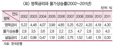 <표>는 우리나라의 2002~2011년 명목금리와 물가상승률, 그리고 이를 바탕으로 계산한 실질금리를 나타낸 것이다. 명목금리는 2~3년 미만의 정기예금 금리를 기준으로, 물가상승률은 전년대비 소비자물가 상승률을 기준으로 한것이다. <표>를 보면 2002년 이후 명목금리가 실질금리보다 높았다. 이 기간 동안 우리나라의 물가가 매년 상승했다는 것을 의미한다. 하지만 미국 대공황의 초기에는 명목금리와 실질금리가 역전되는 모습을 보였다. 당시 물가상승률이1930년 -2.6%, 1931년 -10.1%, 1932년 -9.3%, 1933년 -2.2%로, 물가가 지속적으로 하락했기 때문이다.