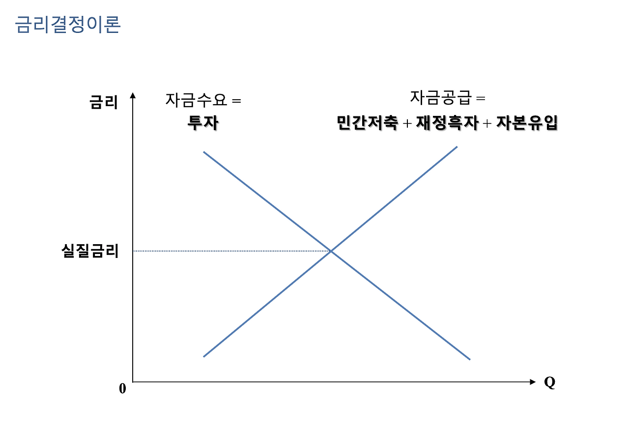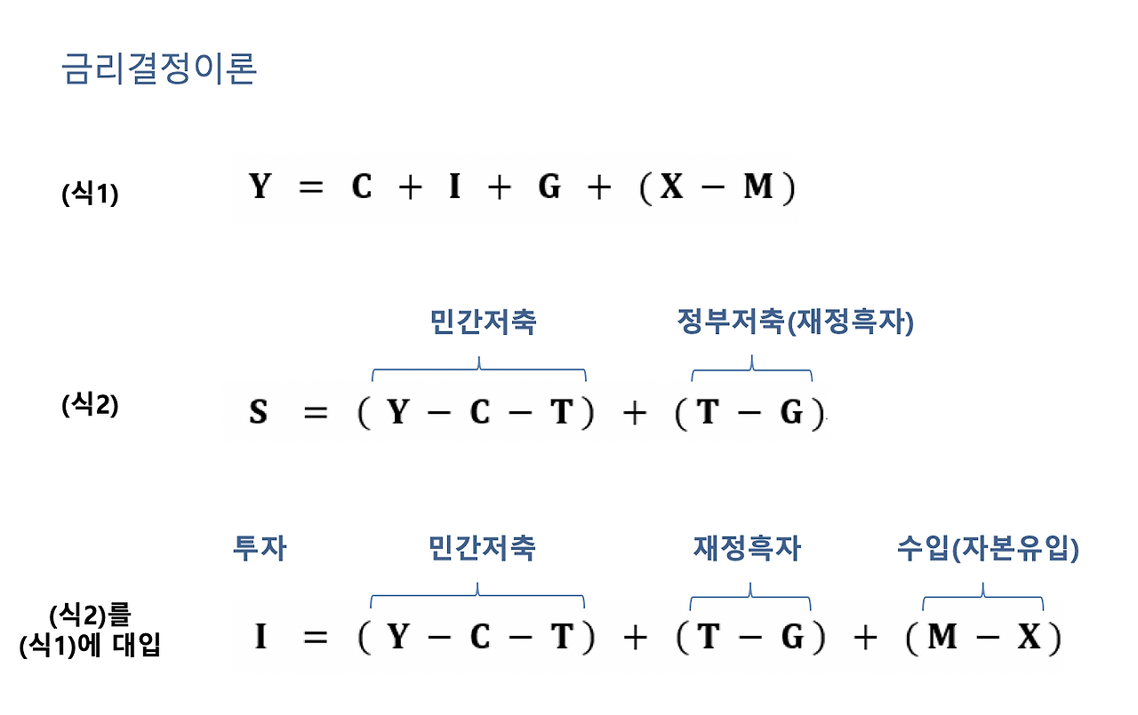 구조적 장기침체 이론을 주장하는 사람들은 지속적으로, 서서히 감소하는 현상을 가지고 부채이론이 사이클로 오르락 내리락한다는 것에 대해서 반박을 한다. 세계적으로 장기침체 이론이 더 설득력을 가지고 있다. 아래와 같이 금리와 연결해서 장기침체 이론을 더욱 설득력있게 설명할 수 있다. 특히 투자가 점점 하락하고 있는 것은 아래 식에서 보면 투자하락'은 민간저축과 재정흑자 그리고 수입이 하락하고 있다는 것을 뜩한다. 다시 말해서 투자가 감소하게 되면 민간저축이나 재정흑자, 자본유입이 있어야 균형이 유지되는데, 투자가 감소하면서 민간저축도 하락하고, 재정흑자와 수입도 하락하게 된다면 어떻게 되겠는가? 도식으로 보아도 사이클로 순환하려면 아래 요소 중에서 한가지 혹은 두가지는 변수가 되어야 하는데, 모두 서서히 하락하고 있는 것이다. 특히 이러한 투자와 관련해서 '금리'의 하락은 모든 것을 설명해 준다.