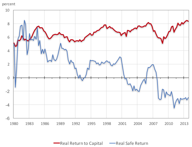 실질금리가 하락했다는 것은 무엇을 의미하는 것일까? 시장 투자자들에게 점차 더 위험회피적이 되었음을 이야기한다. 더 위험회피적이 되어, 안전자산을 더 선호하게 되고 국채금리는 하락하게 되며, 더 높은 위험프리미엄을 요구하게 된다는 것이다. 금리하락에도 불구하고 자본수익률(무위험금리 + 위험프리미엄)은 오히려 증가하는 현상이 발생한다. 금리하락 원인이 투자부족이 아니라 위험 프리미엄 상승 때문이라고 주장하기 때문이다.
