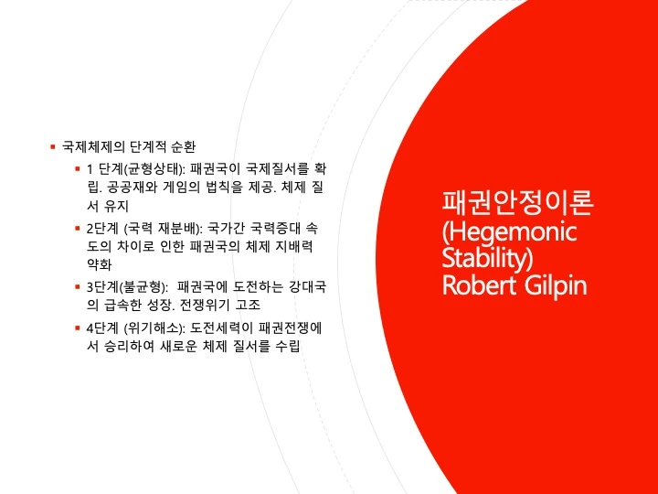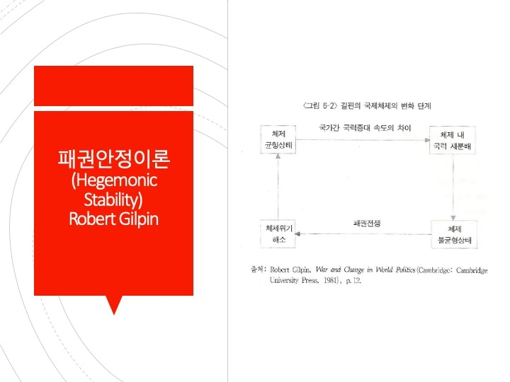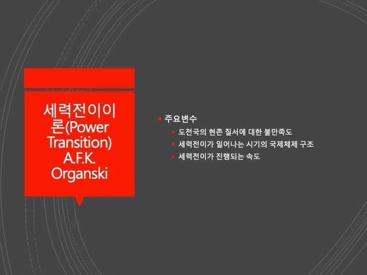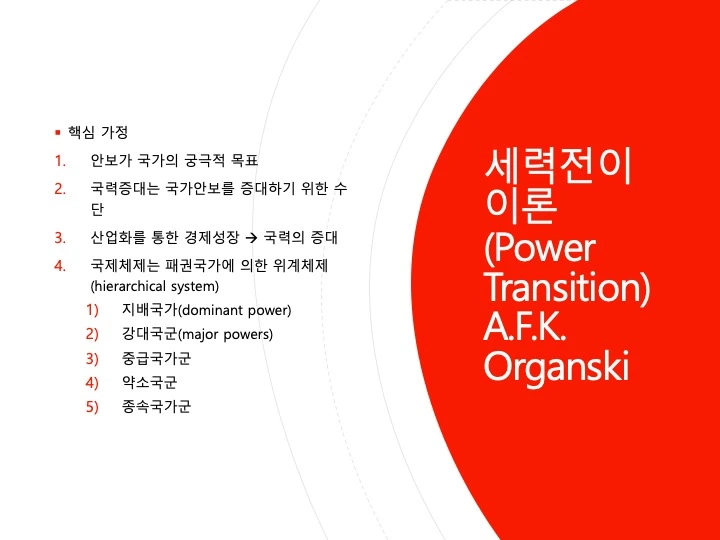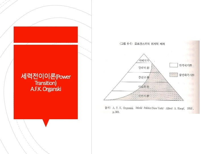 오간스키(A. F. K. Organski)가 주도한 세력전이론은 세력균형이론에 대 한 이론적 불만으로부터 출발하였다. 이 이론은 위계질서, 경제성장, 불만족, 추월, 평형의 개념들로 구성되어 있다. 하나의 지배국가가 등장하여 질서를 유지할 때 세계 체제에 평화와 안정이 오며 지배국의 쇠퇴와 도전국의 융성 이 맞물릴 때 체제 불안정을 가져온다는 것이다. 오간스키는 세계 체제를 지 배국(dominant power), 강대국(great power), 중간국(middle power), 약소국 (minor power)으로 구성된 위계적인 권력의 피라미드로 보고 있다. 세계 체 제의 정점에 오른 지배국은 자신의 이념과 성향이 담긴 세계 질서를 설계하게 되고 다른 국가들은 지배국에 편승하게 된다. 세력전이론의 주요 변수는 권력과 만족도이다.