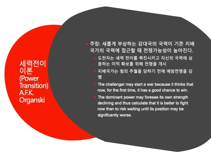 즉, 부상하는 도전국이 현 상태에 불만족을 갖고 지배국에 도전하게 될 때 세계 체제의 불안정이 찾아 오게 되는 것이다. 불만족스러운 도전국의 국력이 지배국의 국력을 추월하 는 시기인 전이시기에 양자 사이의 무력충돌의 가능성이 가장 높게 된다. 오 간스키는 권력을 1인당 GNP, 인구, 상대적인 정치적 능력의 합으로 정의하고 있다. 여기에서 정치적 능력은 정부의 정책 목표를 추진하기 위해 자신의 국 민으로부터 자원을 추출해 내는 정부의 능력으로 정의된다.