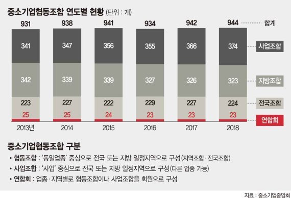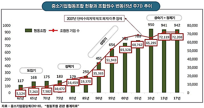 중소기업 협동조합법은 1961년에 만들어졌고 1962년 중소기업진흥회, 1963년에 중소기업협동조합이 만들어졌고 계속해서 지원이 되었다.