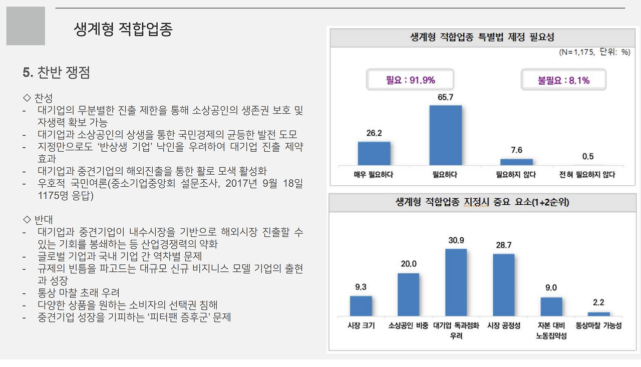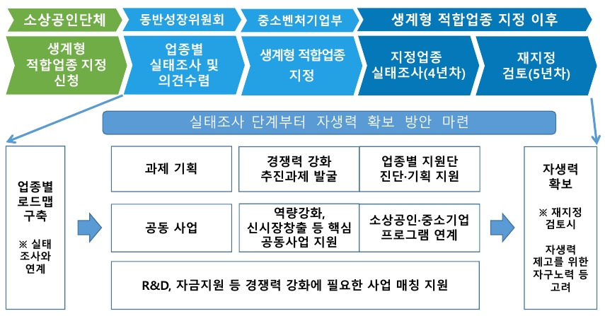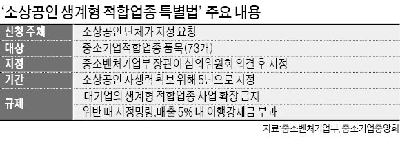 소상공인의 생계를 영위하기에 적합한 업종을 지정하여 보호와 육성을 하귀 위해서 기존의 중소기업 적합업종 지정이 만료되는 업종과 품목에 대기업과 중견기업이 진출하는 것을 제한하는 제도이다.