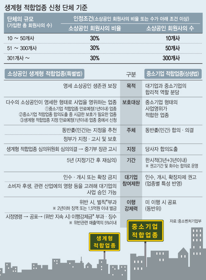 생계형 적합업종은 진입장벽이 낮아 다수의 소상공인이 영세한 사업형태로 그 업을 영위하고 있는 분야로서 중소벤쳐기업부 장관이 지정과 고시하는 업종과 품목이 포함된다.