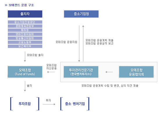 펀드들의 펀드라고 할 수 있다. 모태번드는 개별기업에 직접투자하는 것이 아니고 벤처캐피탈에 간접투자하는 것을 말한다. 정부가 투자를 직접했을 때 문제는 투자위험에 대해서 자유로울 수 없다. 따라서 벤처캐피탈에 위임하여 안정적인 수익을 가지고 오고, 리스크를 분산하는 것이다.