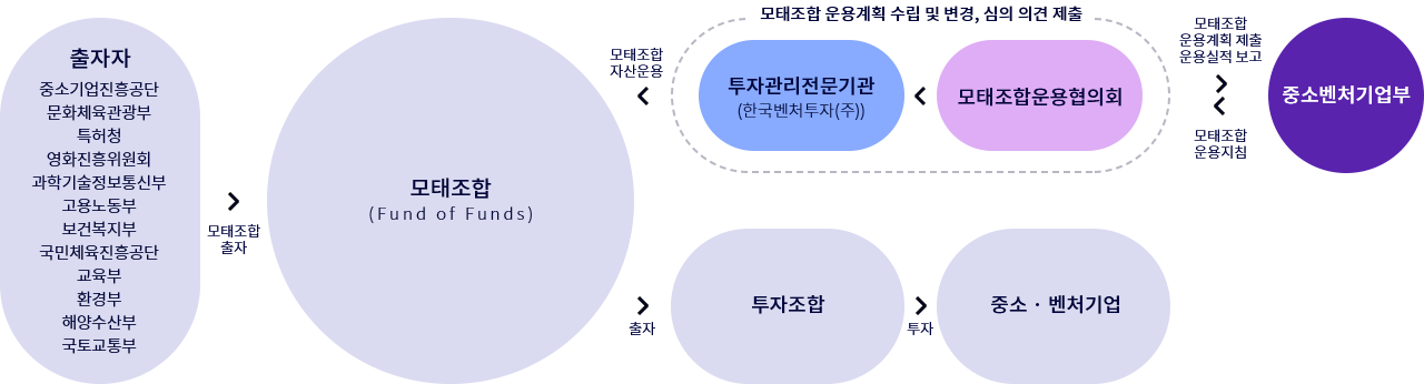 정책효율성 제고를 위해 투자재원 공급은 정부가 하도, 투자의사결정은 전문기관 '한국벤쳐투자(주)'가 담당하고 있다.
