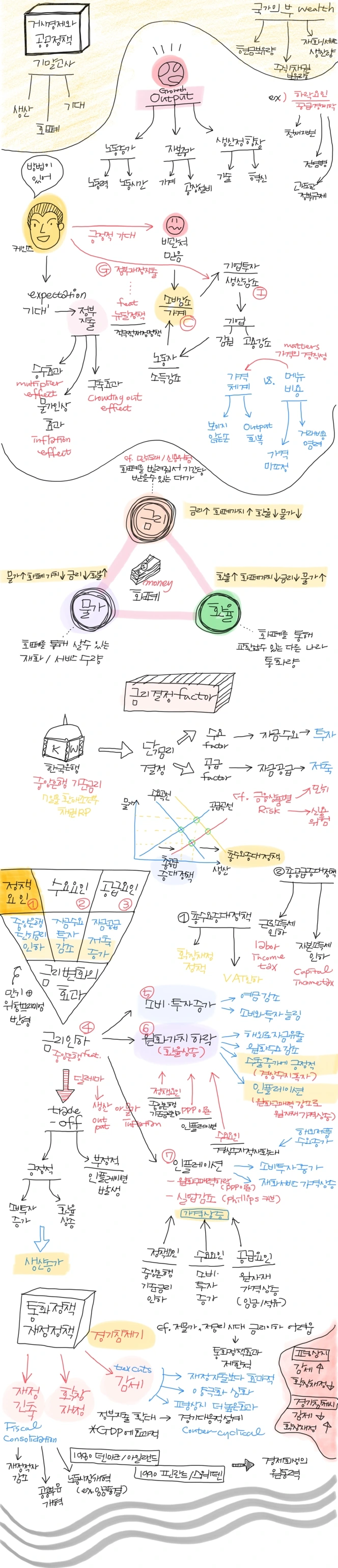 5. 공급경제학의 관점에서는 노동력과 자본과 생산성이지만 1929년 대공황을 거치면서 이 관점은 밀려나고 그 유명한 케인지언들이 등장한다. 미래에 대한 불안이 생산의 요소를 떨어뜨리게 된 것이다. 그러므로 기대를 올리는 '희망의 비전'과 함께 정부지출을 늘릴 수 있는 방법이 필요하다. 미국의 경우가 대표적으로 '뉴질정책'을 통해서 정부지출을 강화했다. 이것은 경제침체시기의 '재정확장정책'에 속한다.