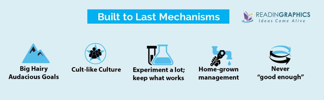 So here we are, the 5 observable mechanisms that Visionary Companies use to bring their core principles to life. In the book and our Built to Last summary bundle, we elaborate on these 5 mechanisms with examples, including tips on how to build your vision, and to translate your core ideology and drive for progress into every aspect of your company.