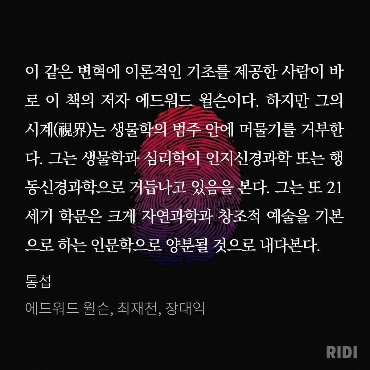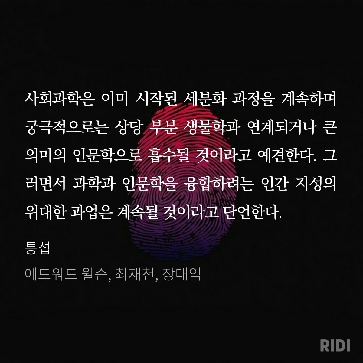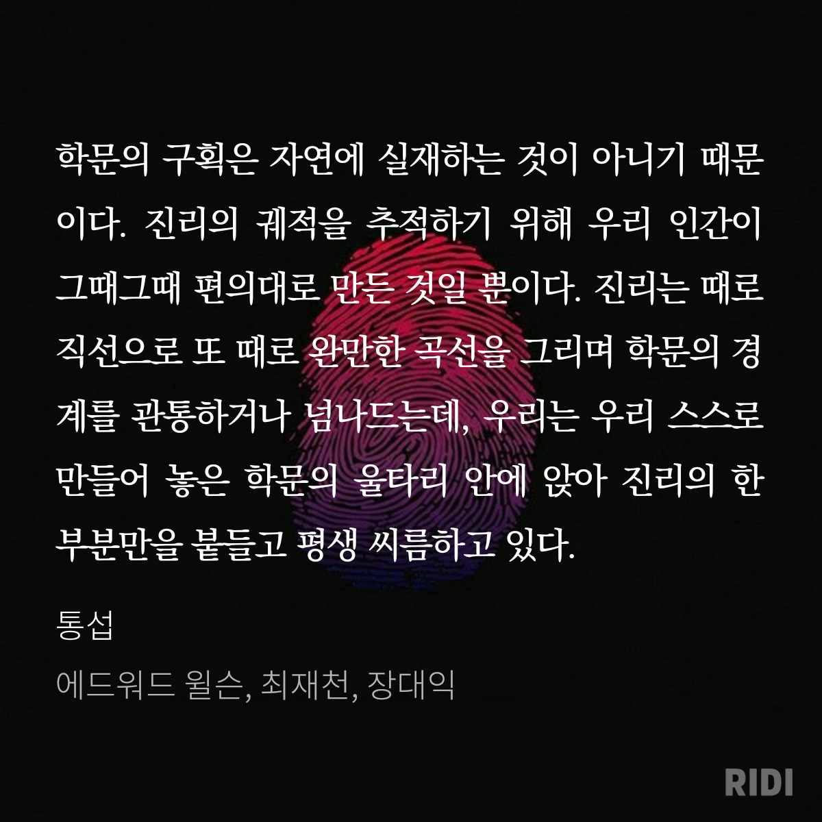 "이 책의 주제는 한마디로 지식이 갖고 있는 본유의 통일성이다. 지식은 과연 본유의 통일성을 지니는가? 인간이 자신을 이해하는 데 이보다 더 중요한 질문이 있을까 싶다. 나는 이것이 철학의 중심 논제라고 생각한다. 이 세상에는 다수의 진리가 존재하는가? 지식은 언제까지나 자연과학, 사회과학 그리고 인문학으로 나뉘어 있을 것인가? 그래서 과학과 종교는 영원히 각각의 진리 영역에만 예속되어 있을 것인가?" ('한국어판 서문' 중에서)