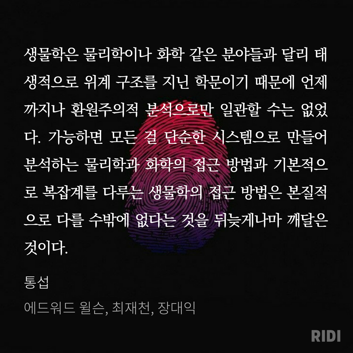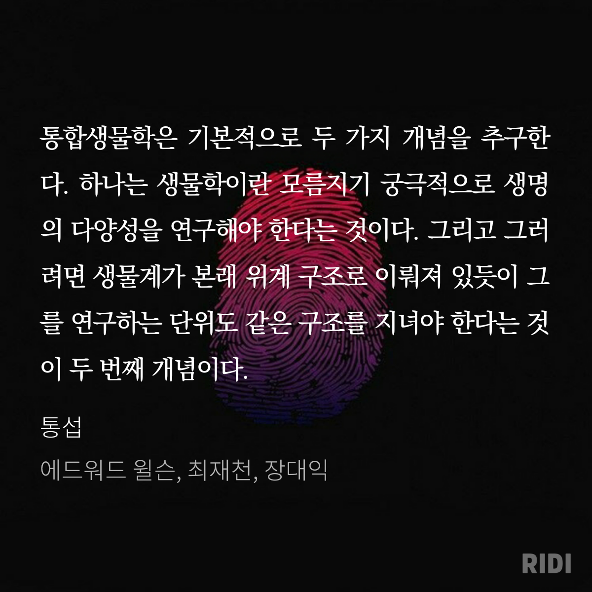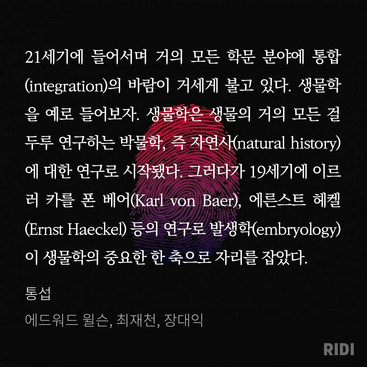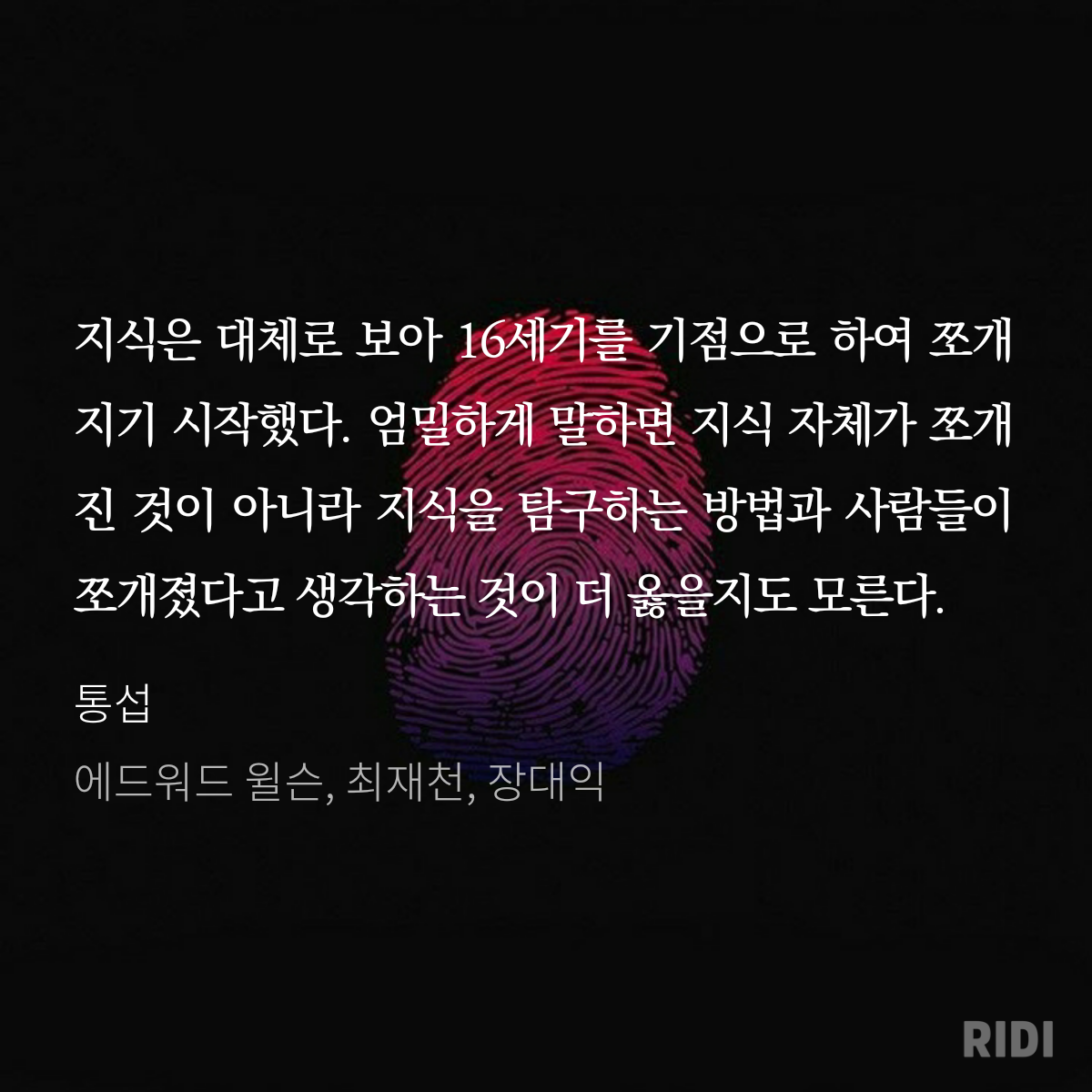 "이 책의 주제는 한마디로 지식이 갖고 있는 본유의 통일성이다. 지식은 과연 본유의 통일성을 지니는가? 인간이 자신을 이해하는 데 이보다 더 중요한 질문이 있을까 싶다. 나는 이것이 철학의 중심 논제라고 생각한다. 이 세상에는 다수의 진리가 존재하는가? 지식은 언제까지나 자연과학, 사회과학 그리고 인문학으로 나뉘어 있을 것인가? 그래서 과학과 종교는 영원히 각각의 진리 영역에만 예속되어 있을 것인가?" ('한국어판 서문' 중에서)