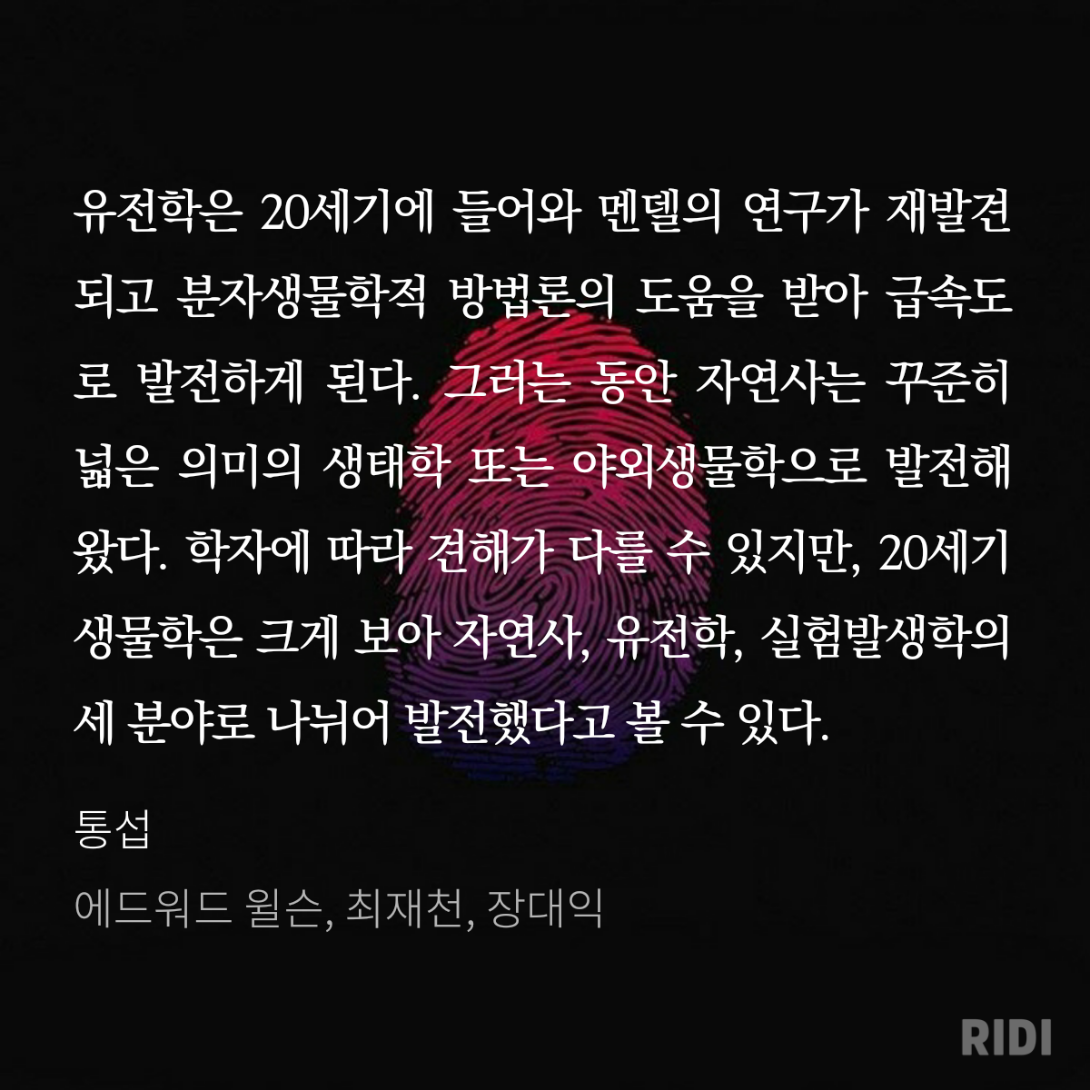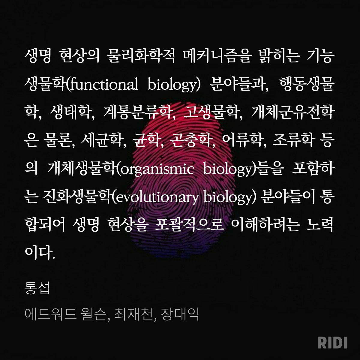 지식의 자유로운 소통을 막는, 분과 학문들 간의 벽을 넘어, 다른 학문에 대한 무지로 인한 오해, 한 용어를 다른 학문의 용어로 옮기는데 있어 비롯되는 혼란 없이 전체를 보아야 한다고 말한다. 얼핏 어려울 듯한 내용을 여러 학문들을 넘나들며 알기 쉽게 설명하는 것을 보면 그게 바로 지은이가 말하는 '통섭'임을 알 수 있다. 매끄러운 번역이 이해를 돕는다.