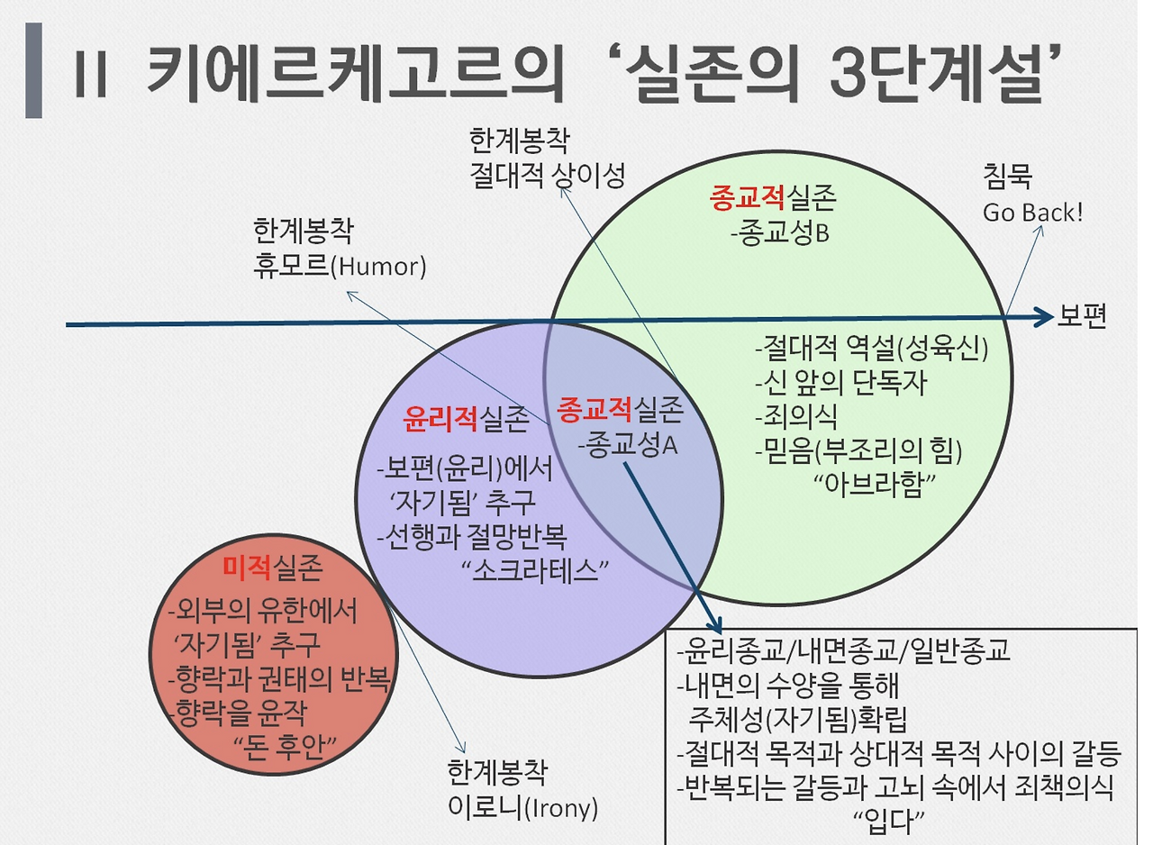 미적실존, 윤리적 실존, 종교적 실존을 이야기한다.