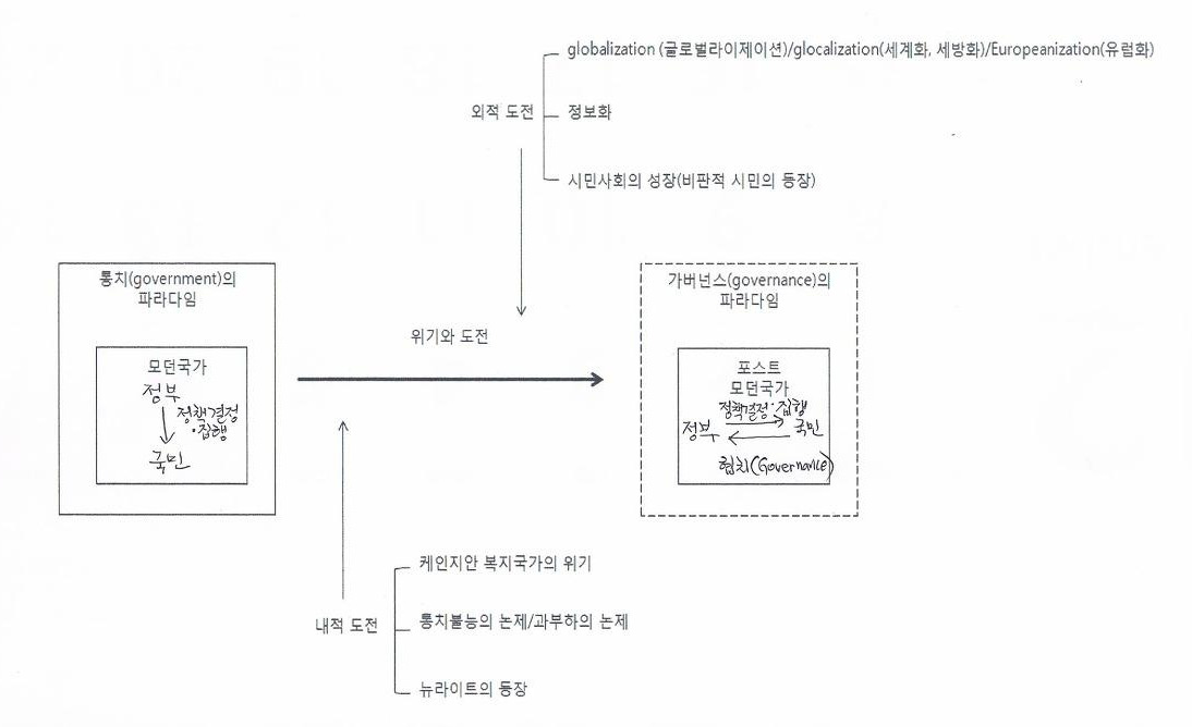 통치패러다임은 기본의 모던 국가에서는 정부가 정책을 결정하고 집행하며 그 대상은 국민이라는 일반적인 것이었다. 그러나 내적도전이 일어난다.
