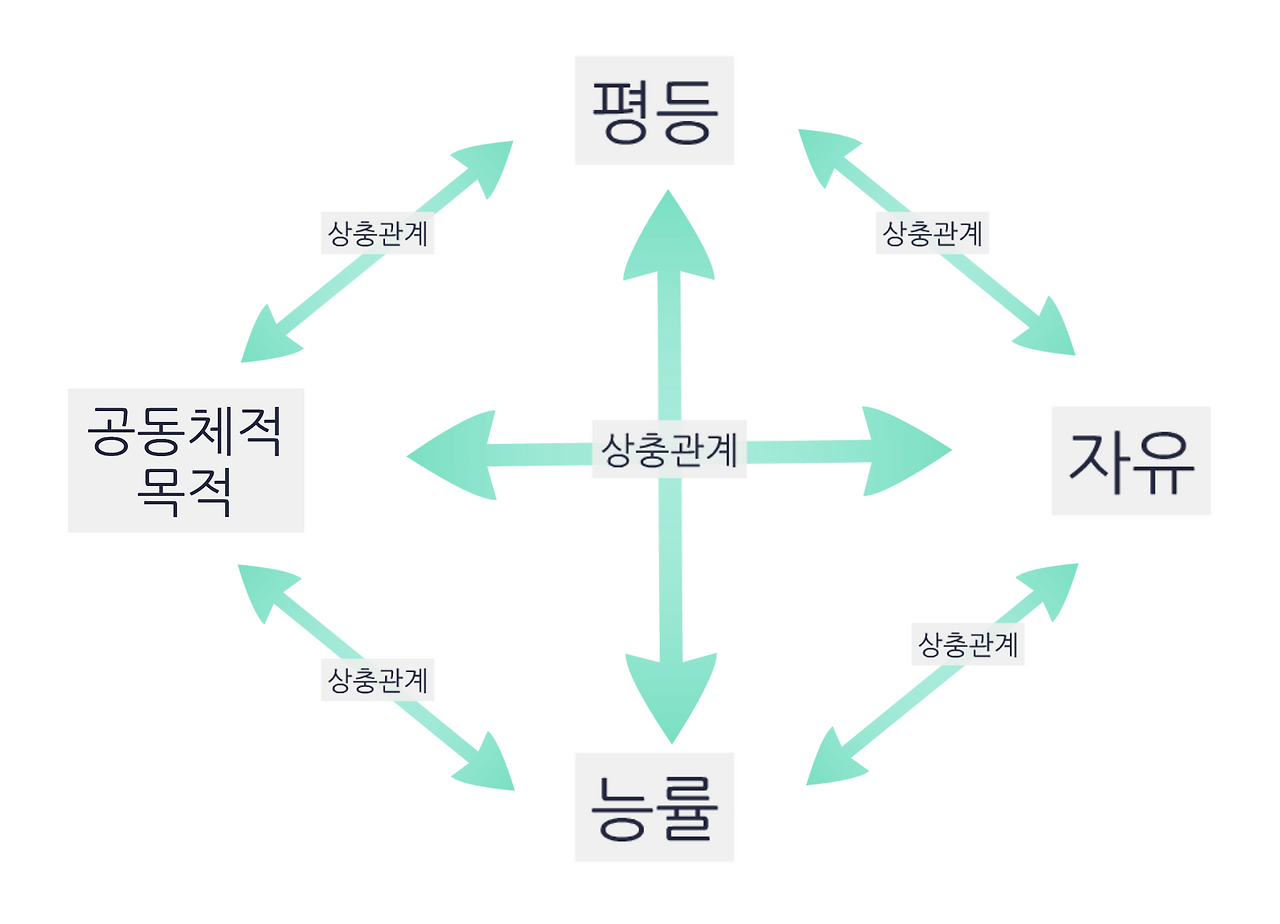 자유liberty, 공동체적 목적community goal , 평등성 equality , 능률성efficiency가 목적에 속한다.
