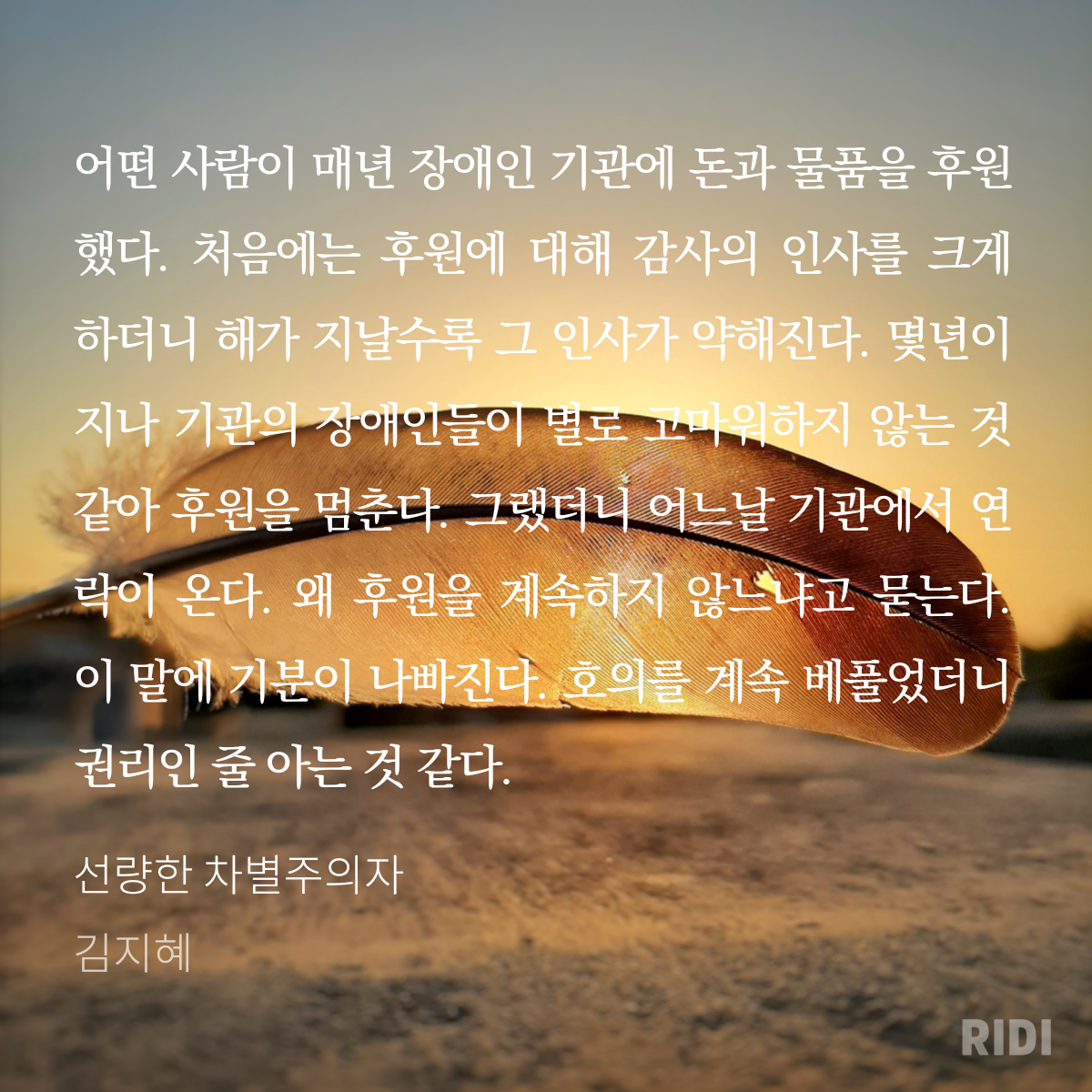 은밀하고 사소하며 일상적이고 자연스럽게 벌어지는 일들 속에서 ‘선량한’ 우리가 놓치고 있던 ‘차별과 혐오의 순간’을 날카롭게 포착해내는 이 책의 메시지는 분명하다. 선량한 마음만으로 평등은 이루어지지 않으며, 익숙한 질서 너머의 세상을 상상하고 모두가 평등한 세상을 조직해가자고 제안한다. 차별을 당하면서도 작은 문제제기조차 해보지 못한 사람들부터 소위 프로불편러까지, 차별과 혐오의 시대에 지친 현대인들이 꼭 읽어야 할 책이다.