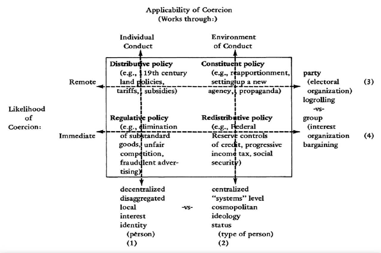 분배정책은 개인의 행위에 적용되면서 강제의 가능성은 희박하다. 구성정책의 경우에는 행위의 환경에 적용이 가능하고 강제가증성을 약하다. 그러나 규제정책은 즉각적이면서 개인의 행위에 영향을 미친다고 볼 수 있다. 마찬가지로 재분배정책은 강제의 가능성에 있어서는 즉각적이면서 개인보다는 전체에게 그 영향이 미친다.