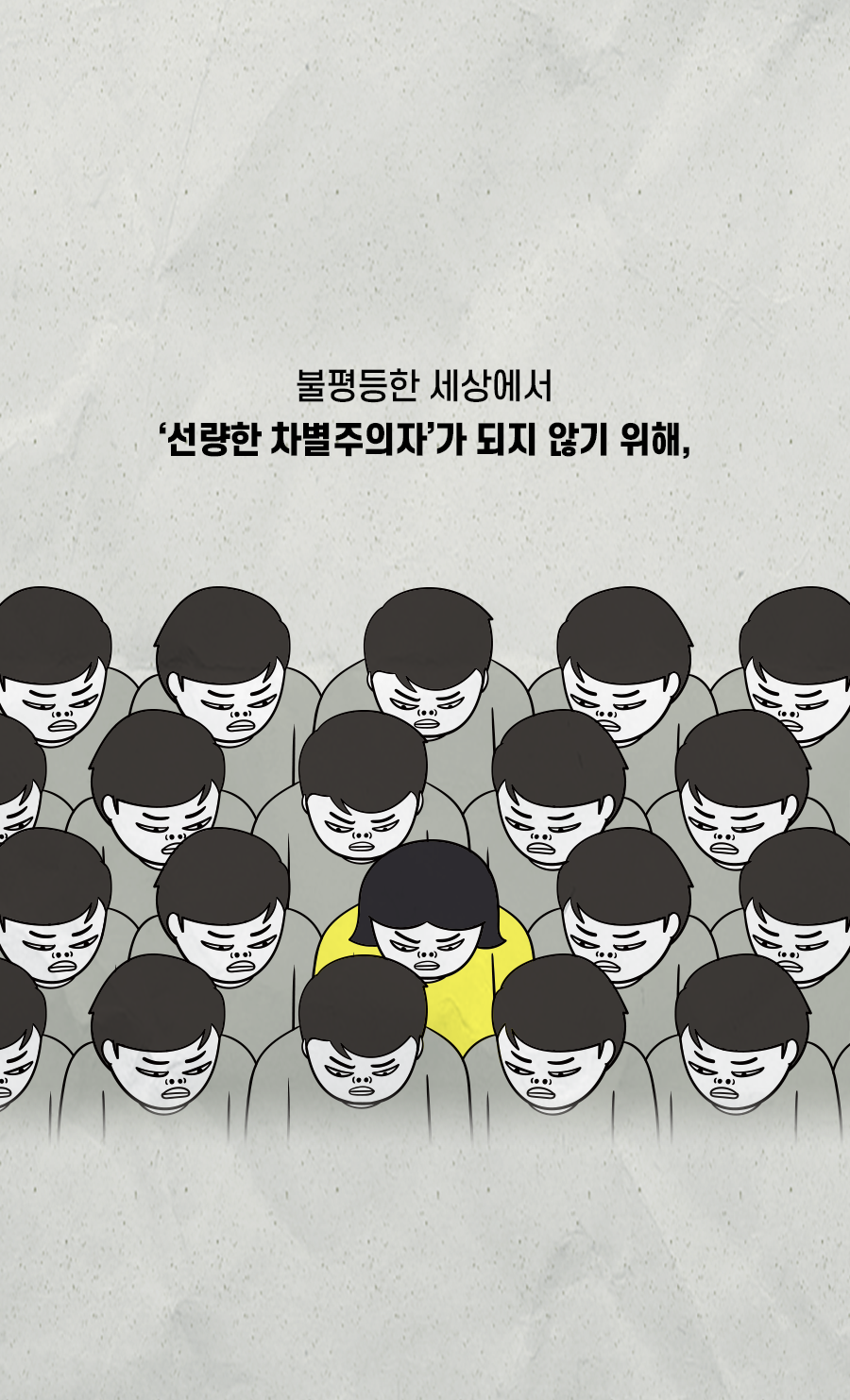 책에서 다양하게 다루고 있는 차별의 사례들 중에서 다문화의 사례도 유독 많이 포함되어 있다. 근본적으로는 '다름'이나 '차이'를 '부정의'와 '차별'로 인식하는 것의 문제라고 생각한다. 다문화역시도 보여지는대로 구분한 것들이 구별이 되고 차별로 이어지는 것을 보게 된다. 그것도 역시 구조적인 차별과 함께 우월성에 근거에서 유럽이나 미국과 같은 인종에 대해서는 우월성을, 동남아나 아프리카 지역에서 온 사람들에게는 열등감을 부여하는 방식으로 작동했다. '다문화'라는 상징질서 안에, 구조 안에 넣어 놈으로써 사람으로서 누구나 가지고 있는 선함과 잠재성에 편견을 입혀 버리는 역할을 했다는 생각이 든다. 그런 의미에서 선량한 차별주의자는 그자체로 모든 부분에서 그렇게 행동할 가능성이 높다. 그러나 반대로 선량한 차별주의자가 구조적인 한계와 모순에서 벗어나는 순간 그 자체로 불량한 포용주의가가 될 수 있다는 가능성도 보게 되었다.