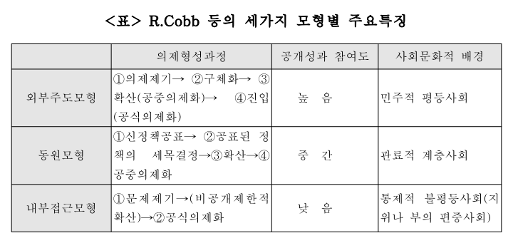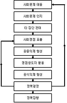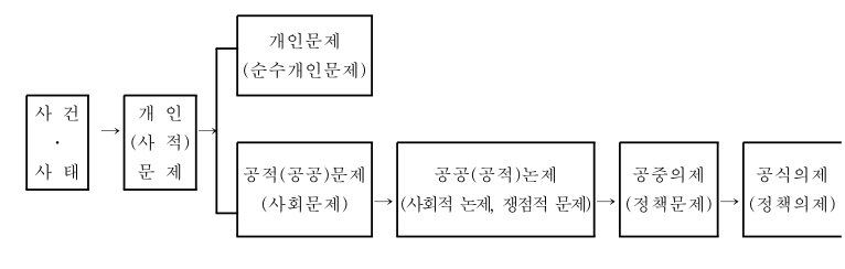 특정한 사회문제가 정부에 의해 해결되기를 바라는 사람들이 그들의 의도를 실현하기 위하 여 정책과정에 참여하는 것을 정책의제형성과정으로 보고 이를 다음과 같은 경로로 설정하였다.