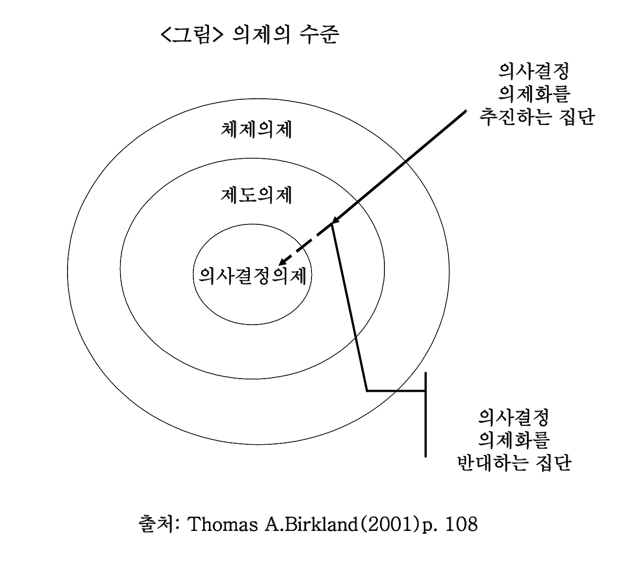 문제의 흐름, 정책흐름, 정치흐름은 체제의제이고, 기회의 창은 제도의제이다.