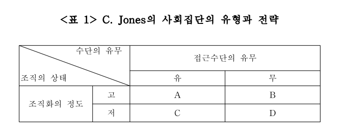 접근수단은 유무, 조직화의 정도의 고저에 따라서 다른 방식의 유형들이 나타난다는 것이다.