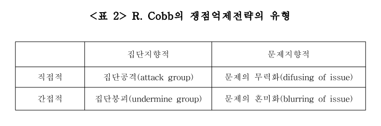 코브의 쟁점억제전략의 유형은 행위자를 중심으로 하거나 문제나 사건자체를 중심으로 보느냐에 따라서 ㅏ누어 진다.
