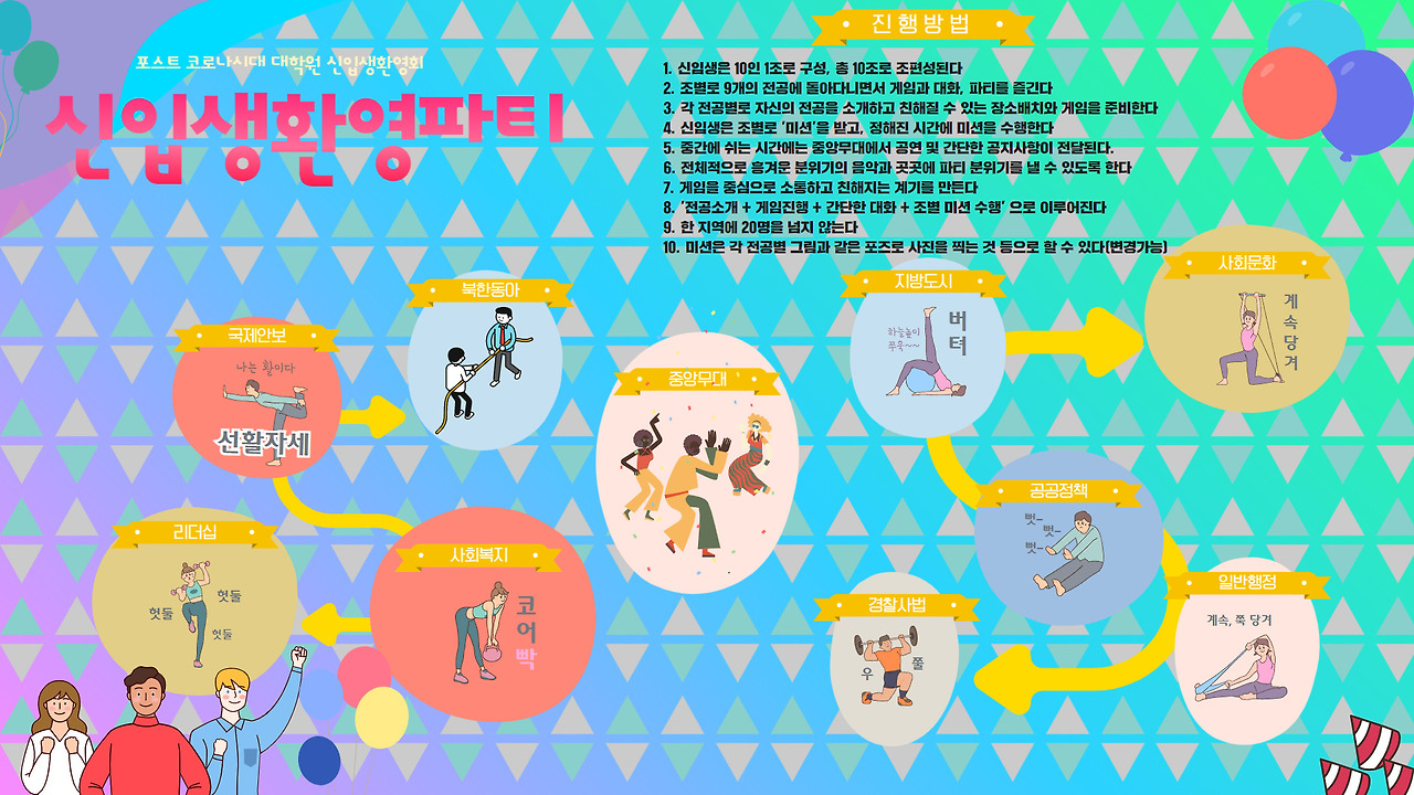 각 학과별도 좋고, 3개의 큰 흐름으로 나누어지는 그룹도 좋다. 핵심은 신입생과 진행하는 원우들이 어떤 경험을 할 것인가? 그 경험이 어떻게 기억되게 할 것인가이다.
