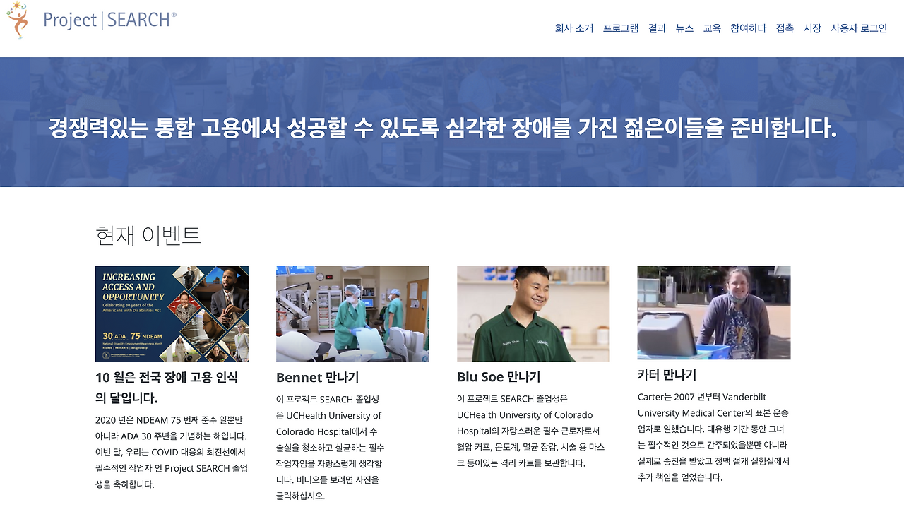 18~21세의 전환기 발달장애인이 기술과 사회적응 교육을 받고 일정기간의 인턴십을 거쳐서 직장에 고용되도록 도와주는 것이 핵심적인 Project SEARCH의 과업이다.