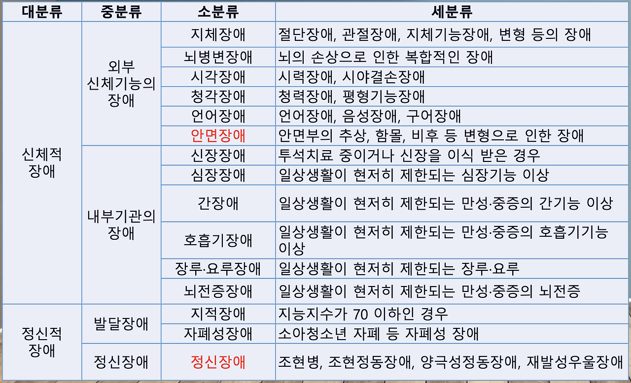 우리나라 장애의 범주는 크게 신체적 장애와 정신적 장애로 나누어지며 신체적 장애는 다시 외부 신체기능의 장애와 내부기관의 장애롤 나누어진다. 정신적 장애는 발달장애와 정신장애로 나누어진다.