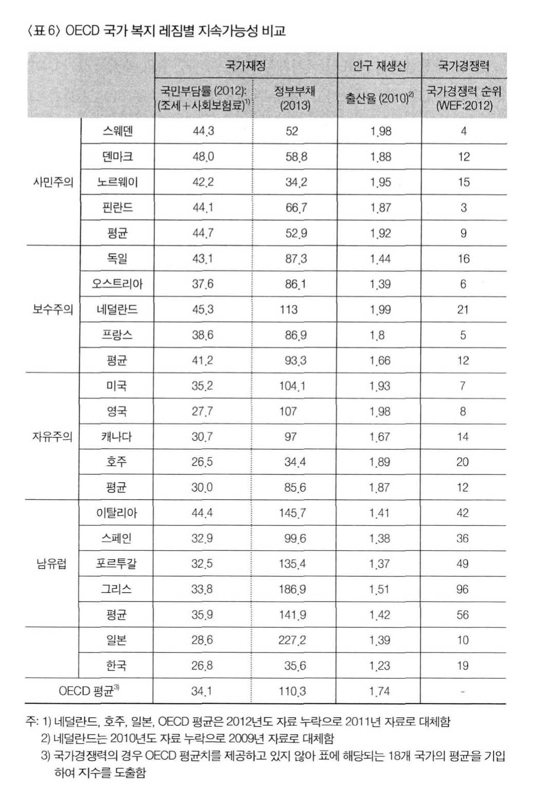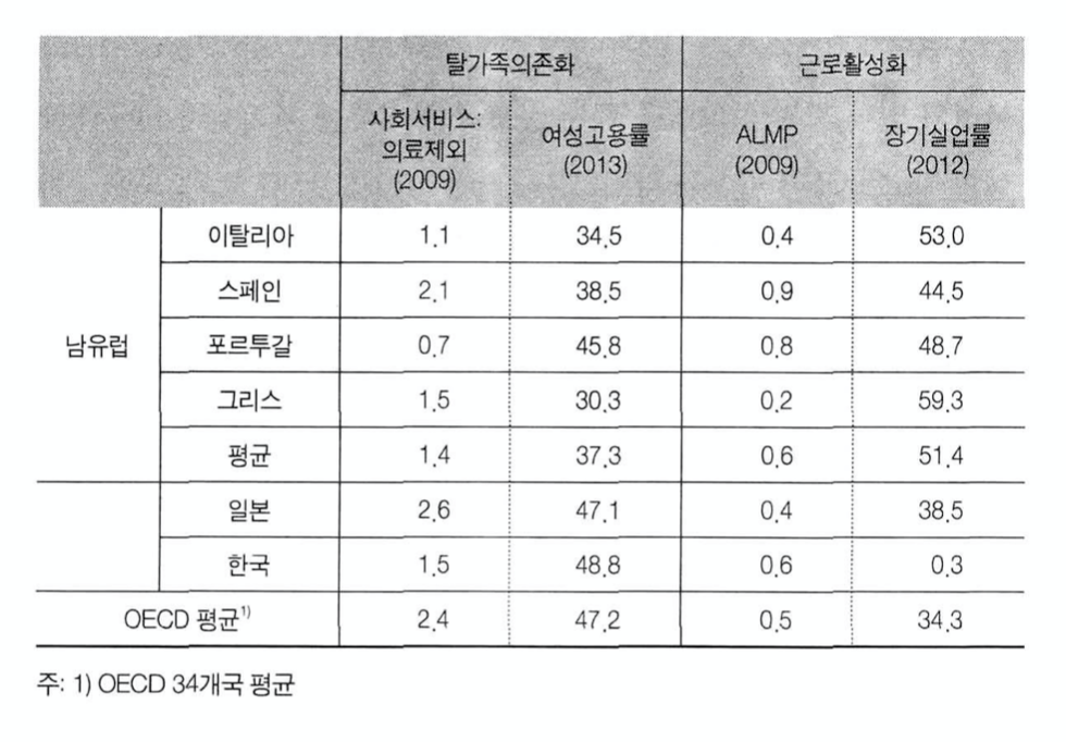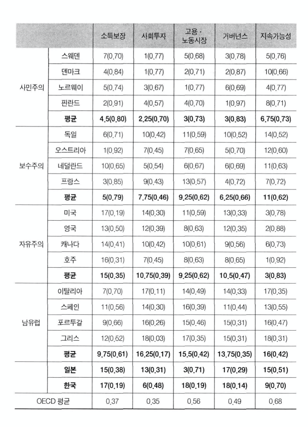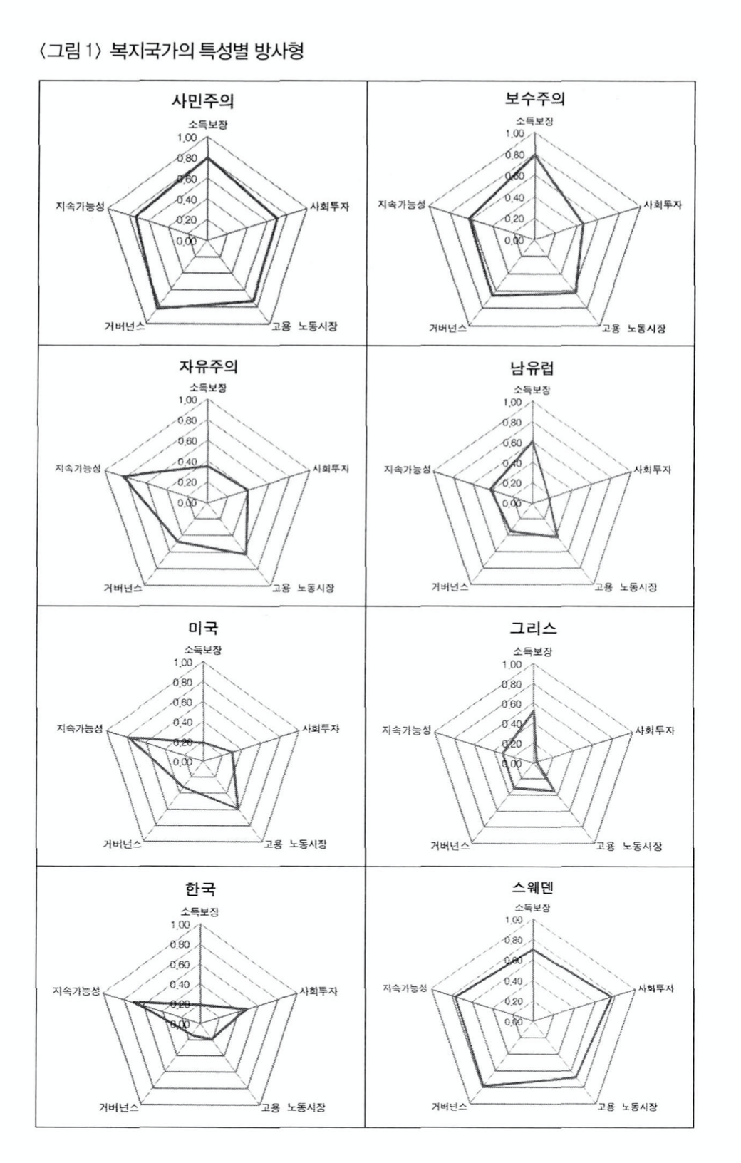 현재 복지국가는 남부유럽과 자유주의 국가의 특성을 강하게 보이고 있고, 그리스와 미국을 합친 듯한 모양새를 보이고 있다. 가치판단의 영역이기는 하나, 그리스와 미국의 혼합형을 한국 복지국가가 가야할 미래로 여기는 사람은 많지 않다.