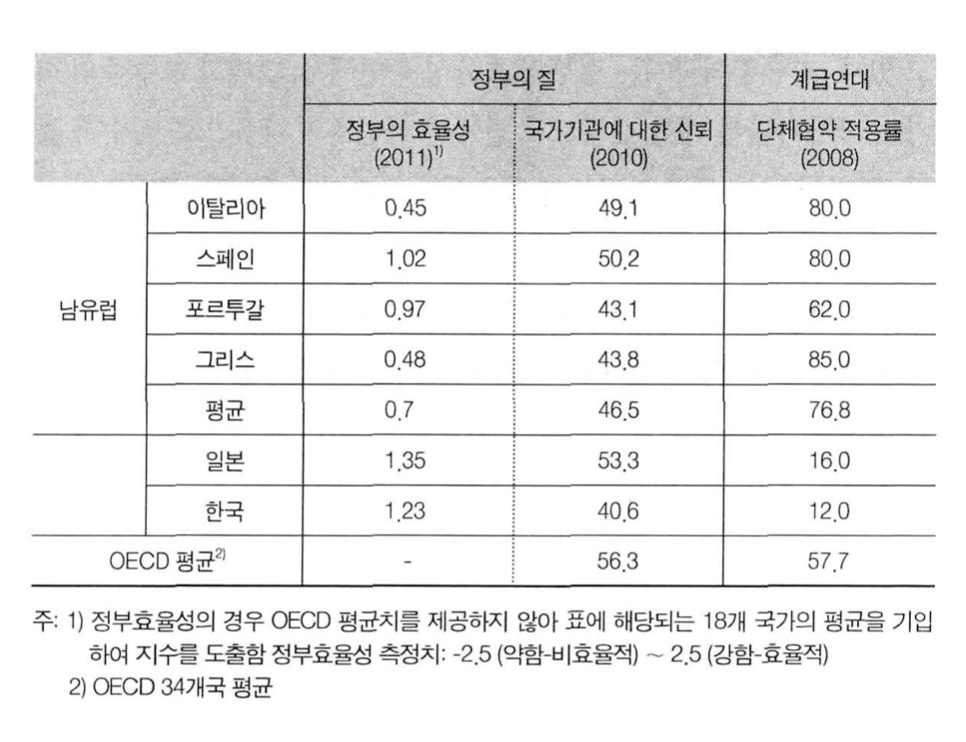 일러한 의식적인 변화는 정치리더십에 대한 국민의 신뢰가 없이는 이루어지 힘들다. 비교적 최하수준인 거버넌스의 질을 높일 수 있는 정치개혁과 노사정의 합의주의, 그리고 노동운동의 연대성 회복을 위한 노력 또한 절실하다 하겠다.