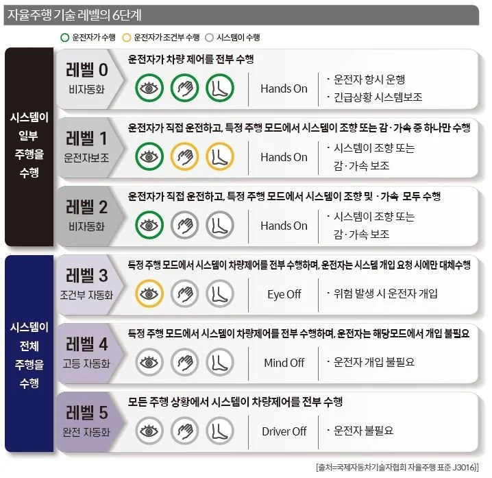 2) 자율주행을 위해서 6단계가 있다. 마지막에는 drvie-off이고 그 전에는 mind-off이다. 앞으로 미래의 자동차는 사람의 마음을 읽고 감성을 반영하는 조명과 음향과 승차감을 제공한다. 이름하여 인포테인먼트라고 한다.