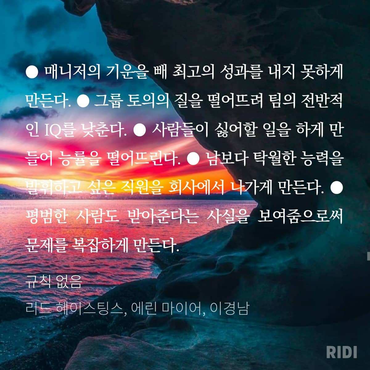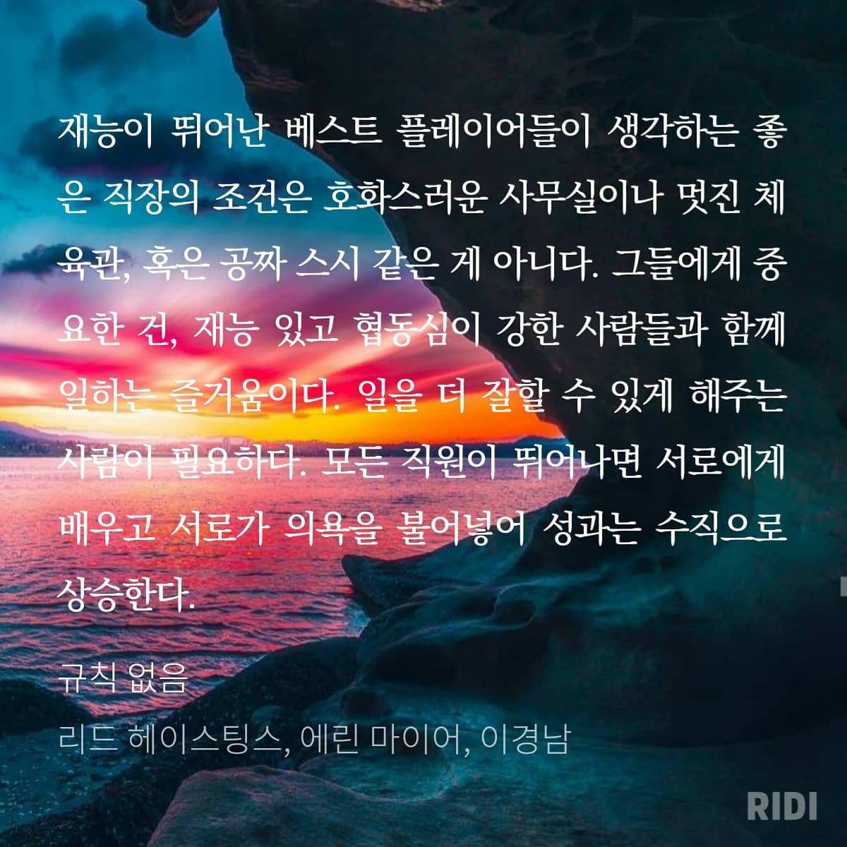 사람들은 넷플릭스를 보고 컨텐츠나 아이디어를 통해서 비지니스 모델을 구축했다는 것 때문에 흔한 실리콘벨리의 회사로 생각하지만, 읽어보면 다른 생각을 하게 된다. 리더십의 뛰어난 아이디어보다도 오히려 중요한 것은 '조직문화'이다. 특히 조직문화 중에서도 '규칙없음'이라는 조직문화를 지속적으로 구축하려고 애를 썼다는 점이다.