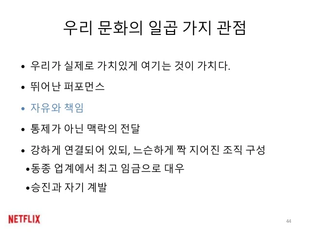 엔터테인먼트 산업계에 지각 변동을 일으켜 ‘포스트 잡스’로 불리는 리드 헤이스팅스는 넷플릭스의 성공 비결로, 그들의 ‘자유와 책임 문화’를 꼽는다. 넷플릭스엔 정해진 출·퇴근 시간이나 근무 시간이 없다. 휴가와 경비에 관한 규정, 결재 승인 절차도 없다. 말단 직원도 자유롭게 의사를 결정해, 수십 억짜리 계약서에 직접 서명한다. 규칙이 없다는 게 규칙인 셈. 그러나 자칫 방만하게 운영되는 것처럼 보이는 넷플릭스의 컬처 데크는 실리콘밸리에서 가장 중요한 문서로 꼽힌다.