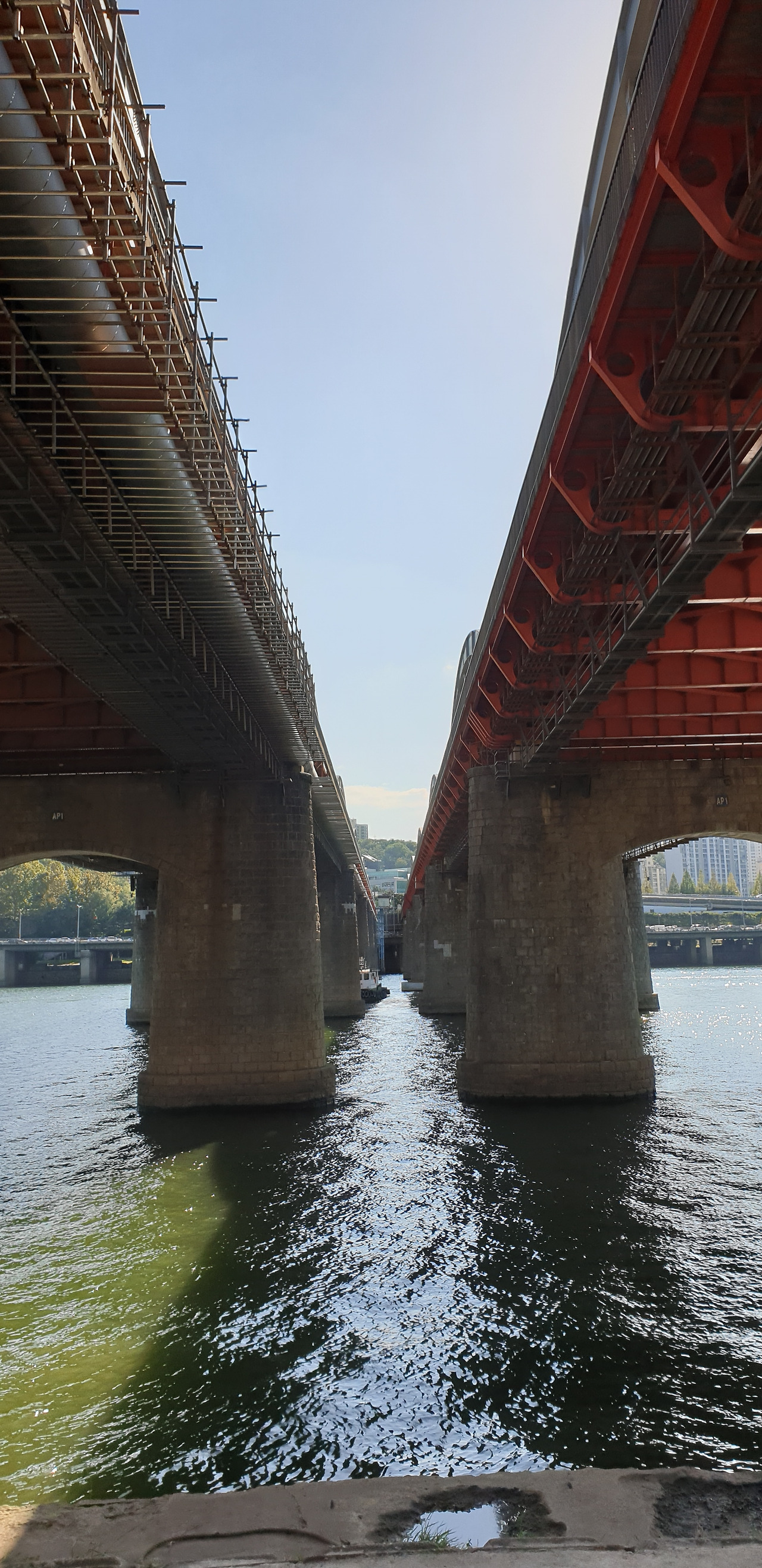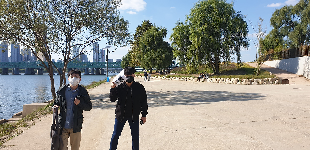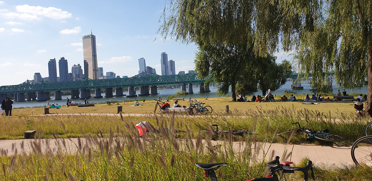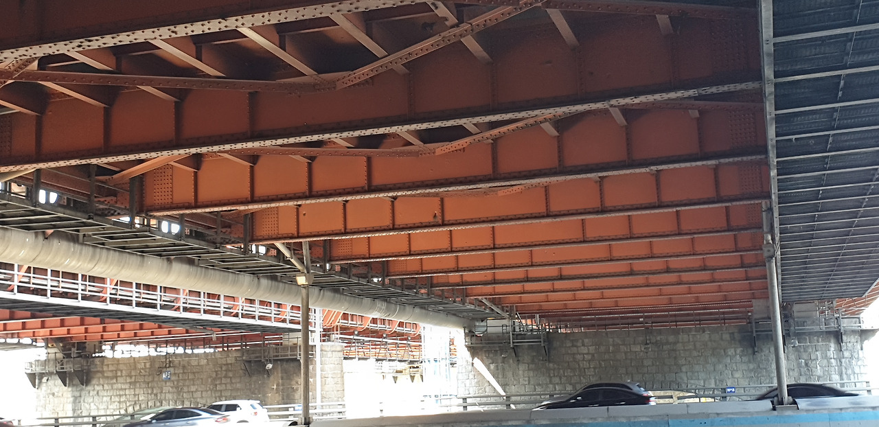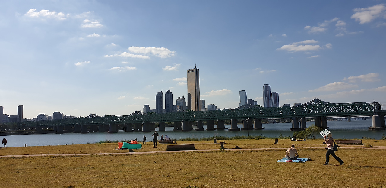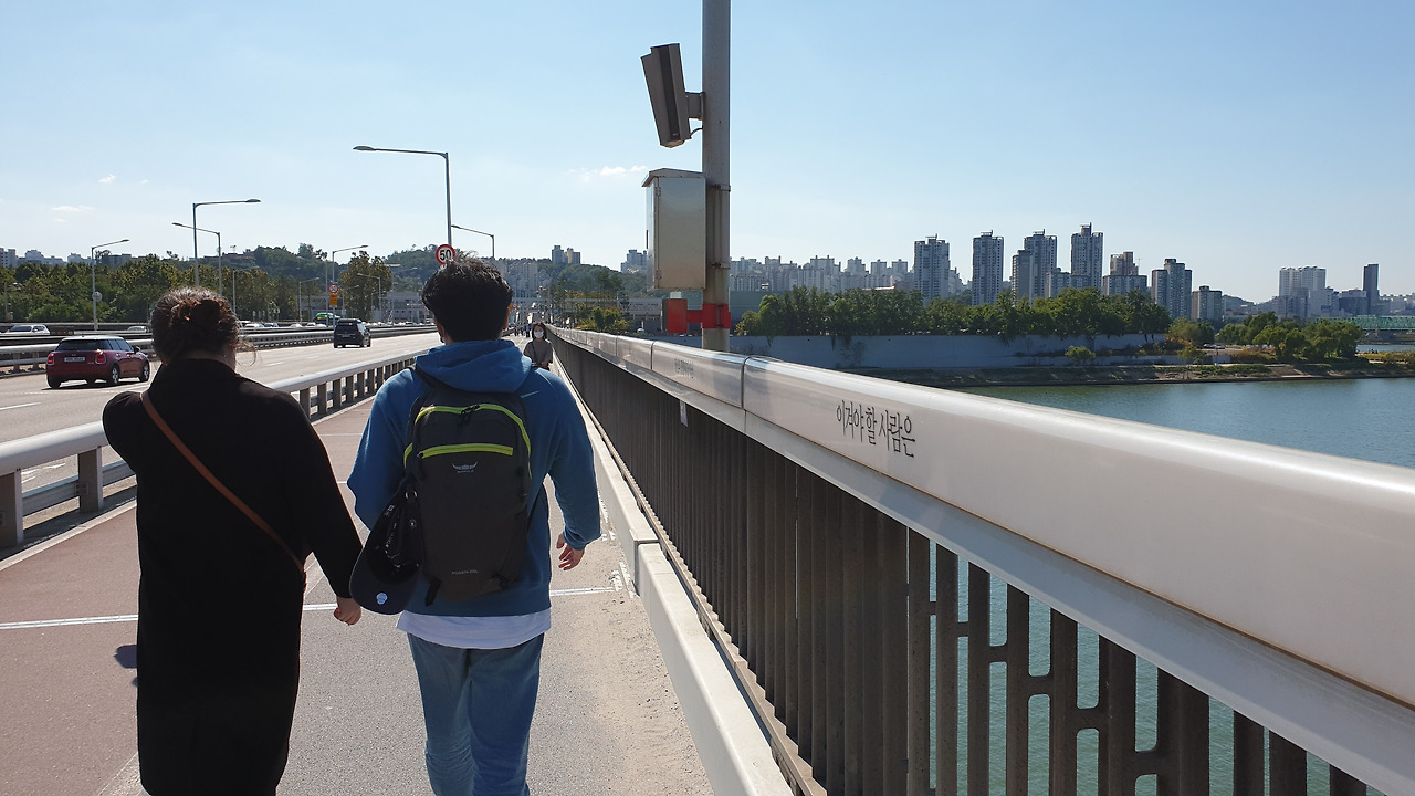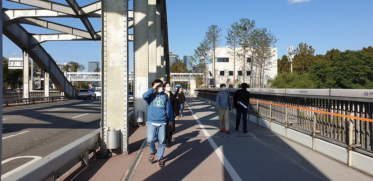 한국전쟁의 흔적이 아직도 한강대교 남단에 남아있다. 수 많은 탄환자국이 보이는데 1958년 복구했을 때부터 지금까지 남아 있다. 전쟁의 상흔이 보이는 가운데 한가로이 자전거를 타는 사람들의 뒷모습이 묘하게 교차했다. 평화와 전쟁 사이에서 우리는 휴전을 하고 있고, 전지작전권이 누구것인지를 논의하는 가운데 '사드'가 배치되냐 마냐를 아직도 고민해야 한다.