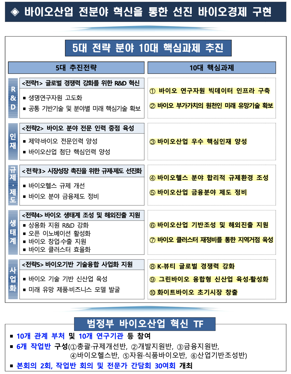 바이오산업을 차세대 주력산업으로 육성하고, 바이오경제 선도 국가로 도약하기 위해 5대 분야 10대 핵심과제 중점 추진한다는 내용이다.