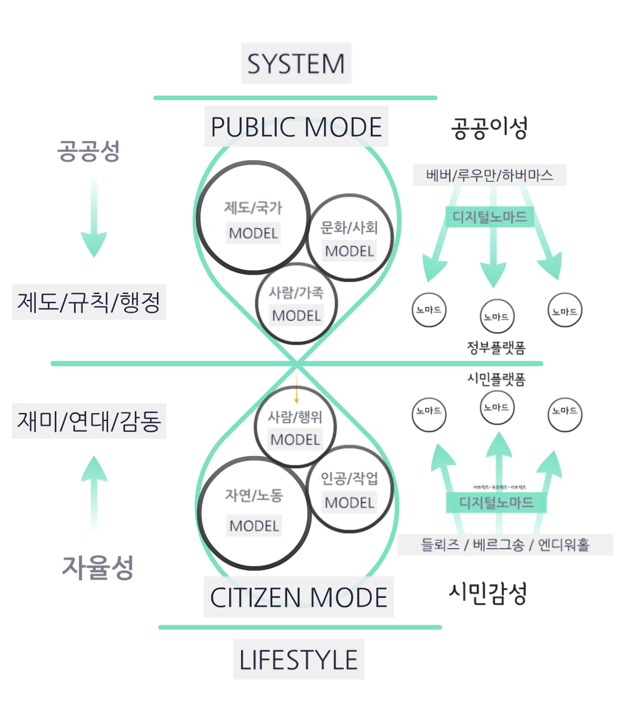 또한 이러한 도식을 공공이성을 중심으로 하는 국가시스템과 시민감성을 바탕으로 하는 시민생활로 나누어 볼 수 있다고 생각했다. 시민들이은 자율성을 중심으로 재미와 연대, 감동에 따라서 노동과 행위, 작업을 하면서 삶을 살아가고 국가는 제도와 규칙을 통해서 행정을 구성하고 사회, 시장, 개인을 모두 움직이는 틀과 방향을 제시한다. 이러한 구분은 현재 상황에 대한 이해를 깊게 해줄 것이며 4차 산업혁명시대, 양극화와 저출산, 세계화에 대한 이해를 깊게 해줄 수 있다. 기존의 역사적 맥락 안에서 제도와 구성요소들이 어떻게 구성되어 있는지를 분석하면 그에 따른 변화와 방향성을 예상해 볼 수 있다.