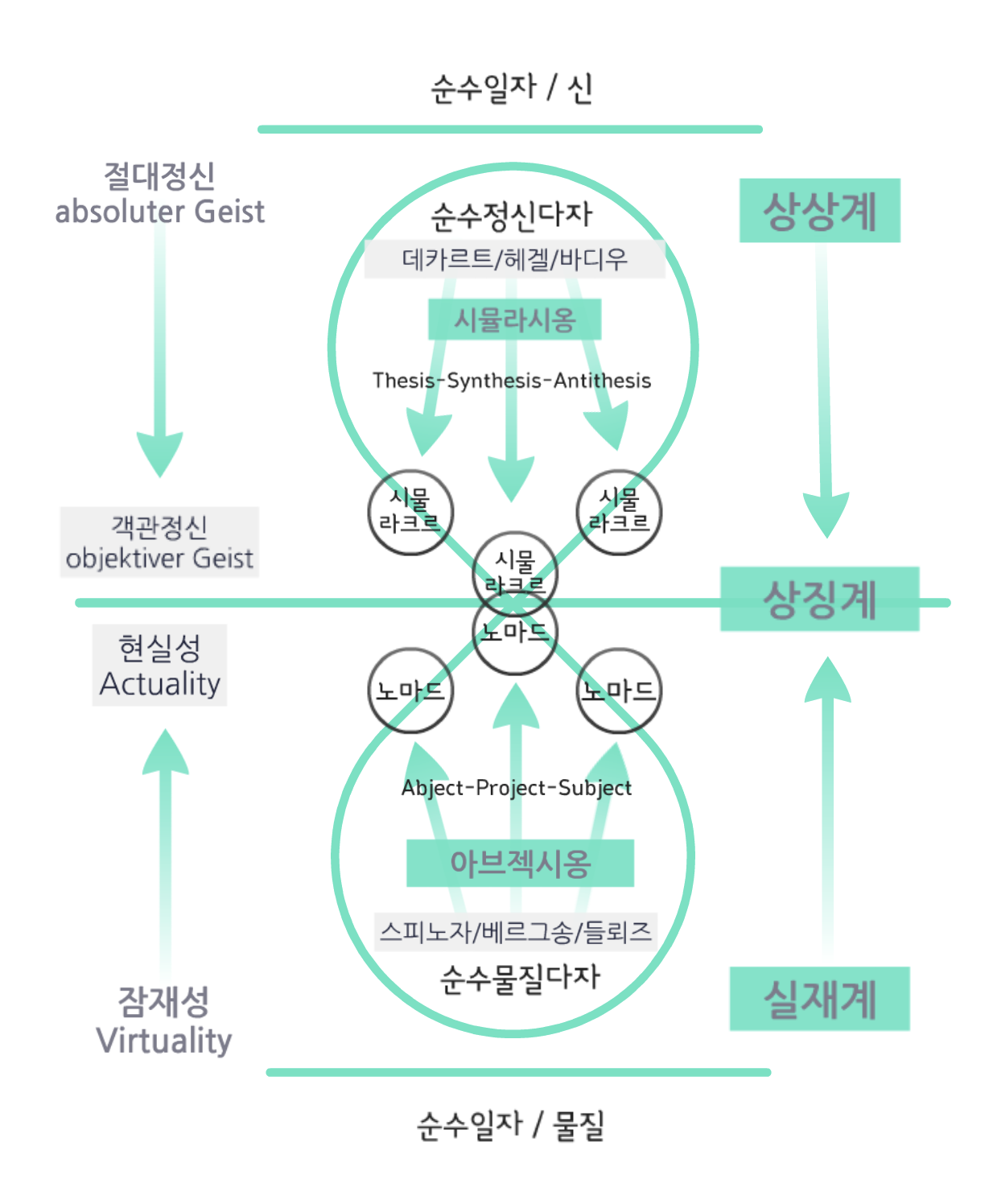 국가와 시민이 어떻게 연결되고 만나는지에 대한 다양한 철학적 논의들을 아래 그림과 같이 정리해보았다. 다양한 자료들을 참고해 보았으나 창의적으로 구성해보았다. 정신과 물질의 대립은 고대부터 현재까지 지속적으로 논의의 소재가 되었다. 제1의 기계의 시대가 물질로부터 시작된 기계의 시대였고 아날로그의 시간대였다면, 제2의 기계의 시대는 정신적인 변화였고 디지털의 시대가 되었다. 이러한 정신과 실재의 도식은 자크라캉에 오면 상상계와 실재계로 대변될 수 있고 이러한 상상계와 실재계가 만나는 지점에 상징인 언어, 제도, 규범이 만들어지는 것을 볼 수 있다.