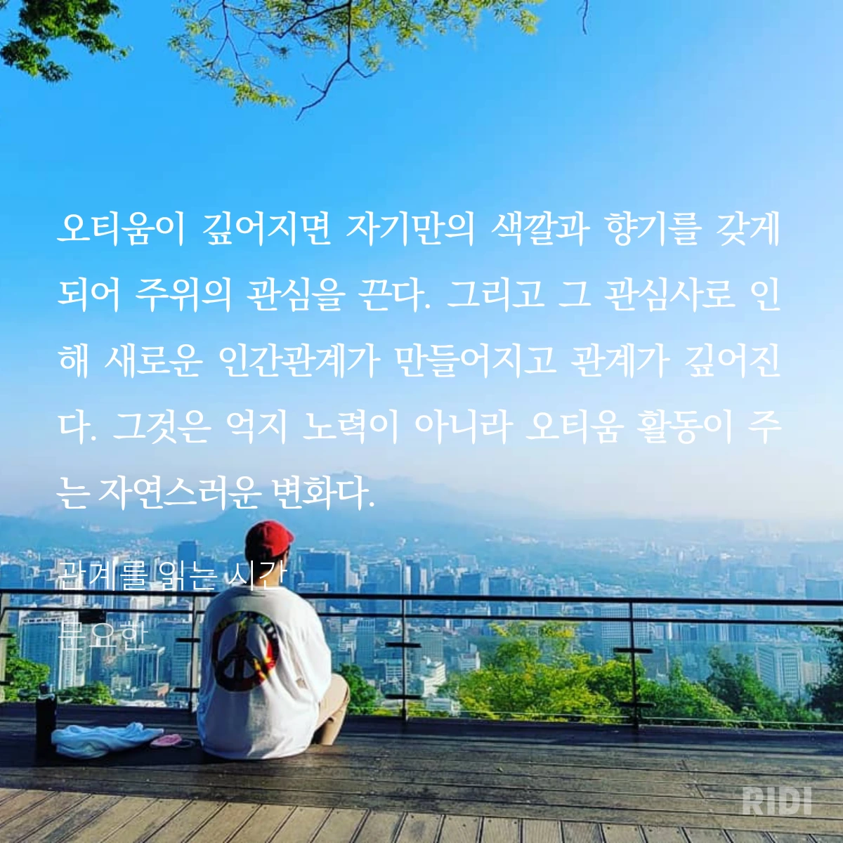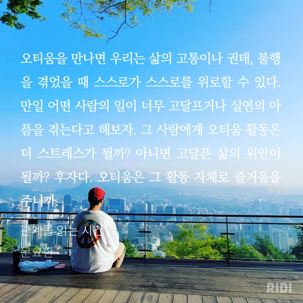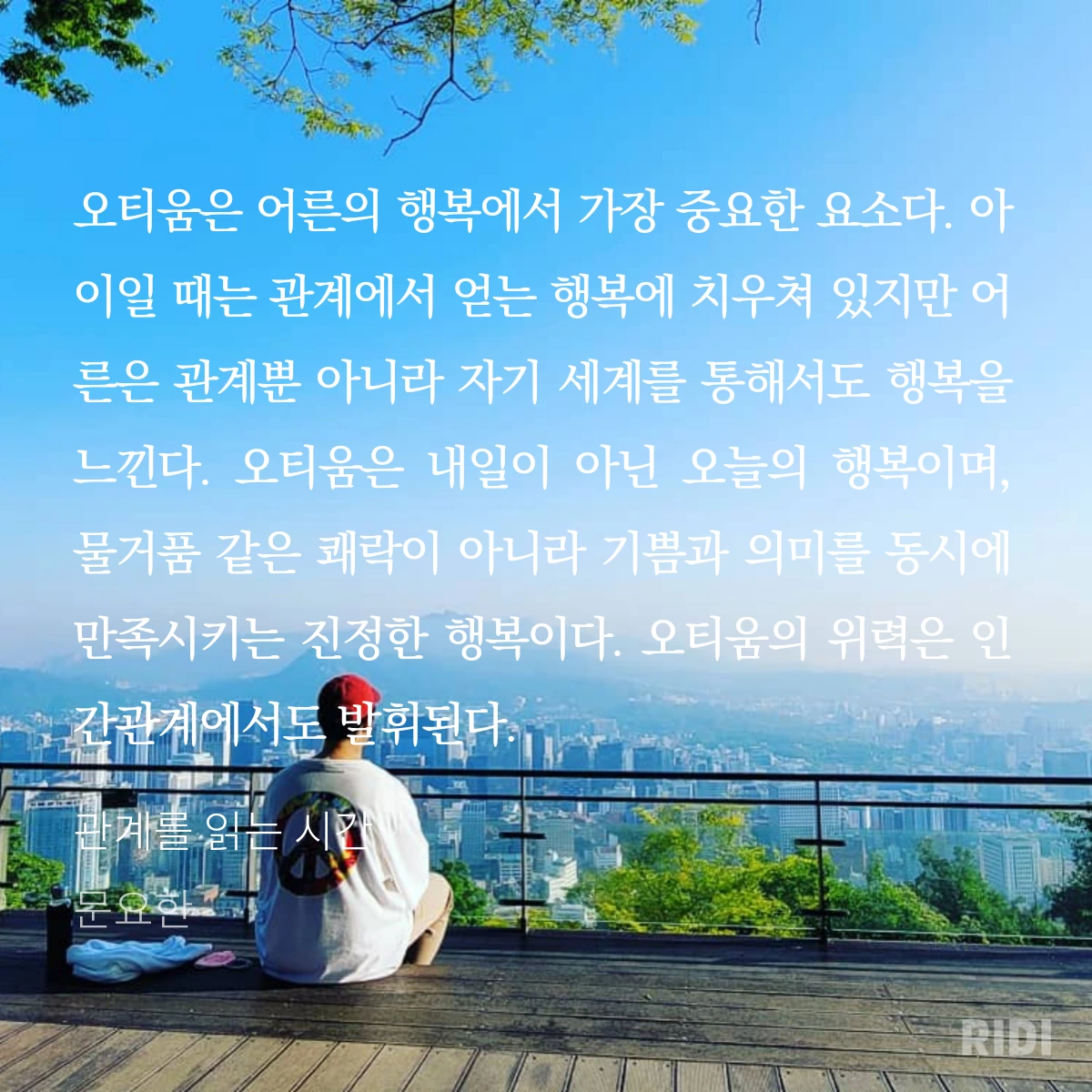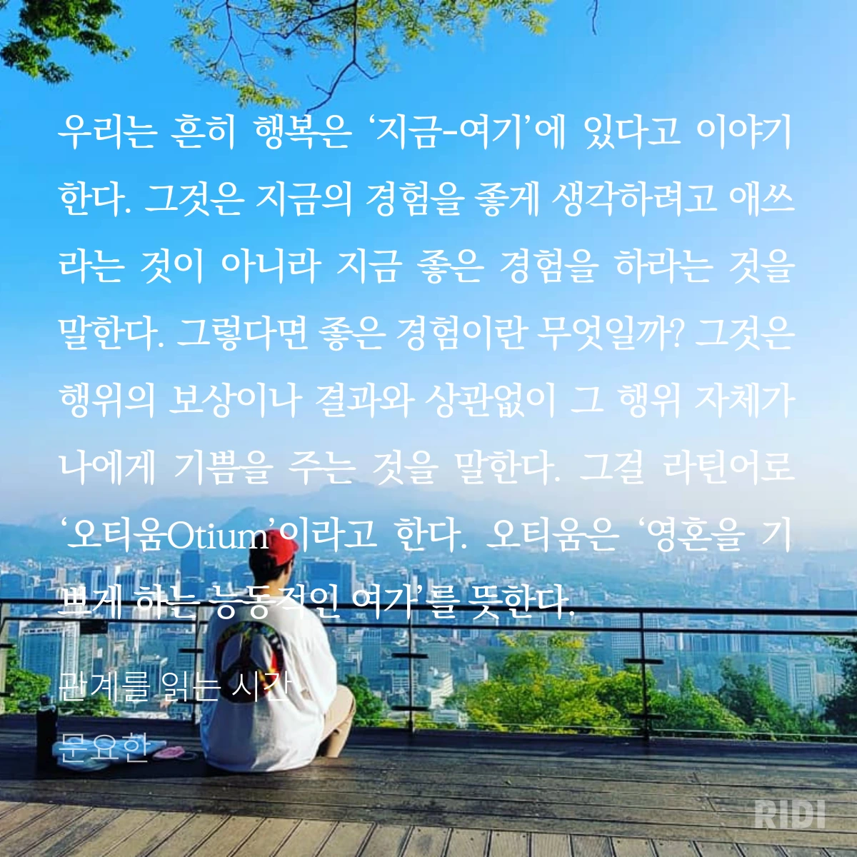 여가라는 것을 혼자 갈 수 없는 사람이 있다면, 아직은 오티움의 단계로 못 들어가는 것일지도 모른다. 인스타그램이나 페이스북에서 자신의 얼굴을 많이 드러내보이는 사람은 자신이 존재한다는 것을 사람들에게 인정받고 싶어하는 욕구가 크다고 한다. 언제나 작용 반작용이 있는 것이니까, 그것은 스스로 인정받지 못하고 있다는 증거가 되기도 한다.