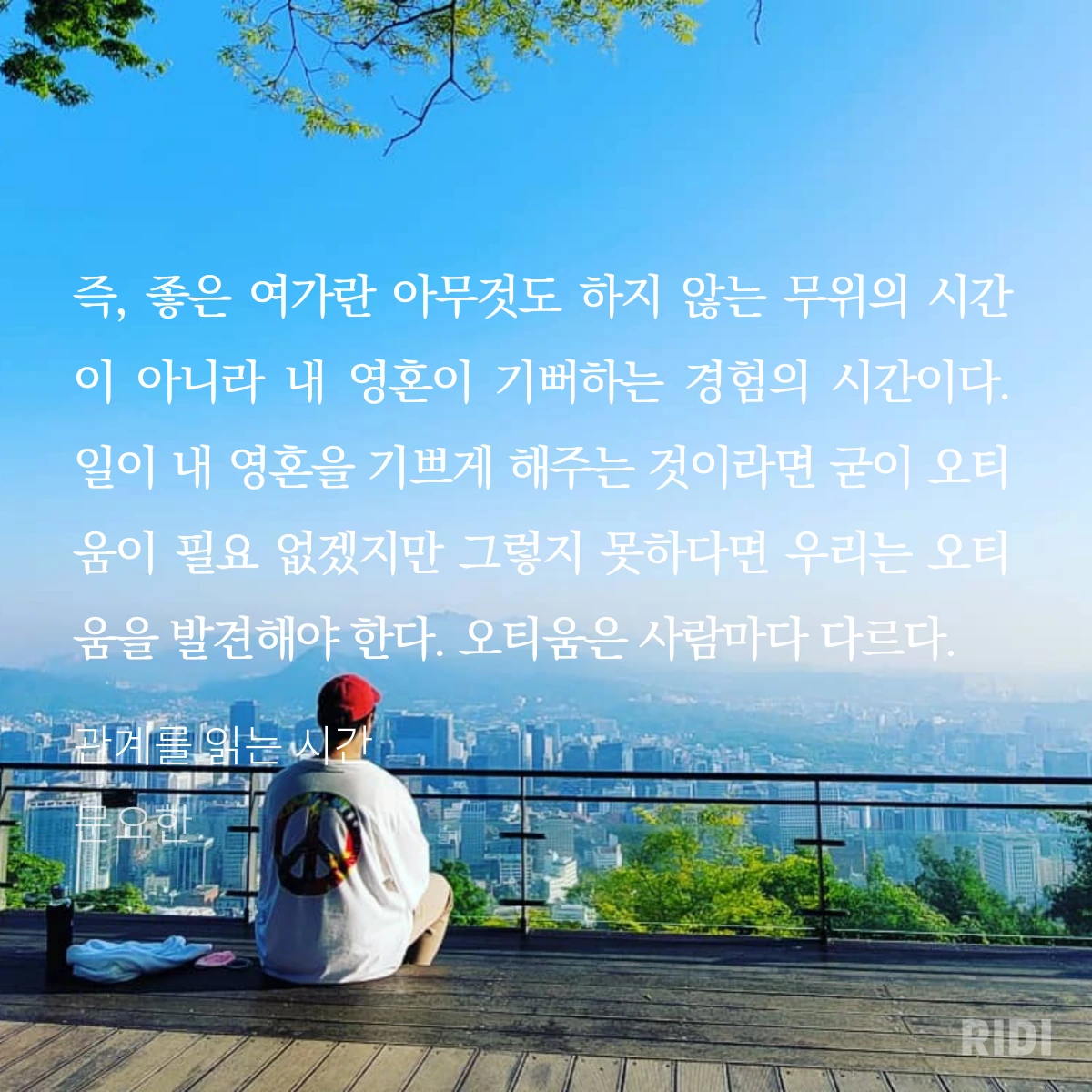 '진정한 여가'라는 것은 아무것도 안하고 푹 쉬는 것이 아니라 내 영혼이 기뻐하는 시간이다. 다른 사람이 행복하니깐 나도 행복하다가 아니라 내가 행복하니깐 다른 사람도 행복하다가 되는 때가 '진정한 여가'의 시작이라고 할 수 있다. 인생을 항상 조건적으로, 반대급부에 치우쳐서 살다보면 집으로 돌아오는 길, 혼자 있는 토요일 오후에는 허무함이 시간을 매운다.