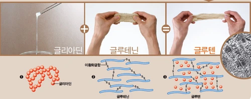 글루아딘과 글루테닌이 만나서 쫄깃쫄깃한 클루텐이 만들어진다.
