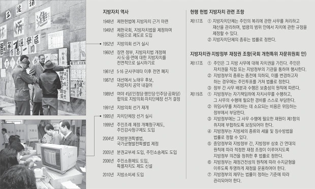 1948년에는 처음으로 제헌헌법이 만들어졌다. 117조, 118조에 주민자치라는 항목이 들어가고, 지방자치라는 요소가 들어갔다. 규정상, 명목상 들어갔다. 1949년에 지방자치법이 제정되고 1952년에 지방자치제도를 시행한다. 제 1차 현대적 지방자치제도를 시행할 때 1952년에 시읍면 의원선고를 하고 5월에 도의원 선거를 했다. 도지사는 임명했기 때문에 직선은 아니었다. 1961년도에 와서 군사정부가 들어섰고 지방자치제도를 중단시켰다. 1991년 3월에 지방자치구역이 시군구라는 단위로 발전하였고 3월에 시군구 의원선거를 하였다. 1991년 6월에는 광역의회의원선거를 하였다. 1995년에는 단체장 선거까지 하면서 기초의회, 광여단체장등 지방선거가 통합되었던 것이다.