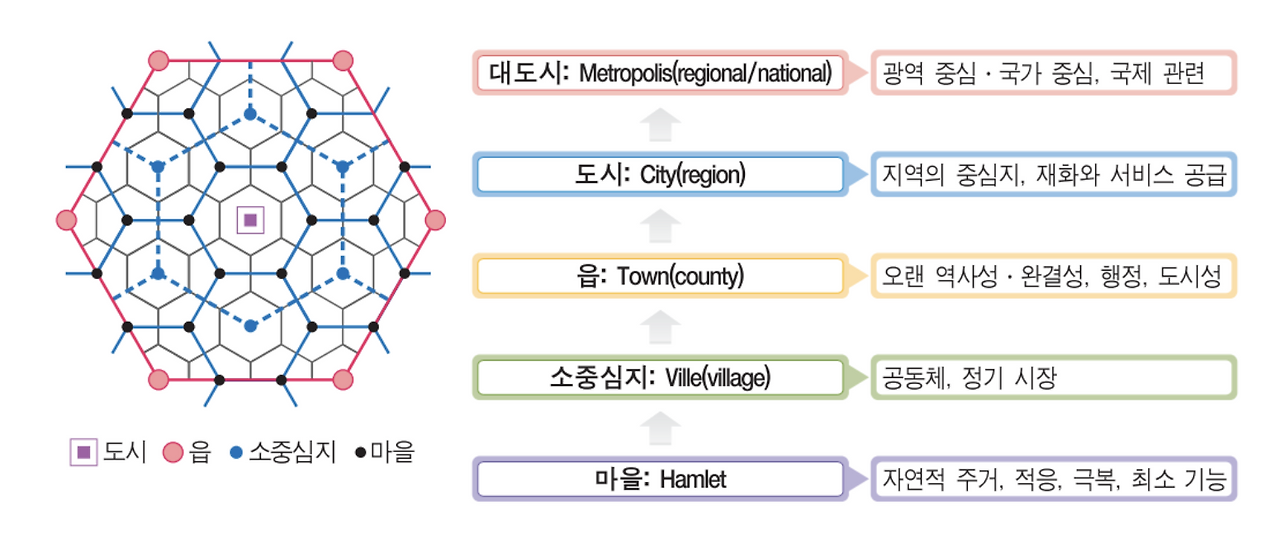 장소는수평적으로 보면 기능적으로 분화되고 중심지와 주변지로 나누어지기도 하지만, 아래와 같이 수직적으로 위계를 가지기도 한다.