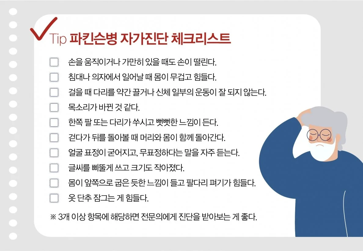 파킨슨병은 운동신경에 영향을 받아 근육이 점점 굳어지는 병이라고도 할 수 있다. 손을 움직일 때 힘들거나, 손떨림이 자주 발생하거나 쉽게 알아볼 수 있다. 그러나 더 쉬운 방법은 옷 단추를 잠가보는 것이다. 옷 단추를 잠그는 게 힘들다면 파킨슨병을 의심해보아야 한다. 또한 손가락으로 글씨를 쓰는 것도 쉽게 파킨슨병을 알아보는 수 있는 좋은 방법이다. 아래와 같이 자가진단 테스트를 통해서 자신과 부모님의 파킨슨병을 미리미리 발견하여 치료를 받으면 좋겠다.